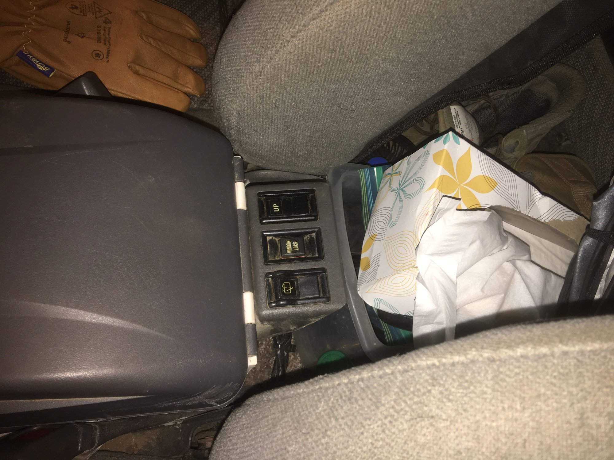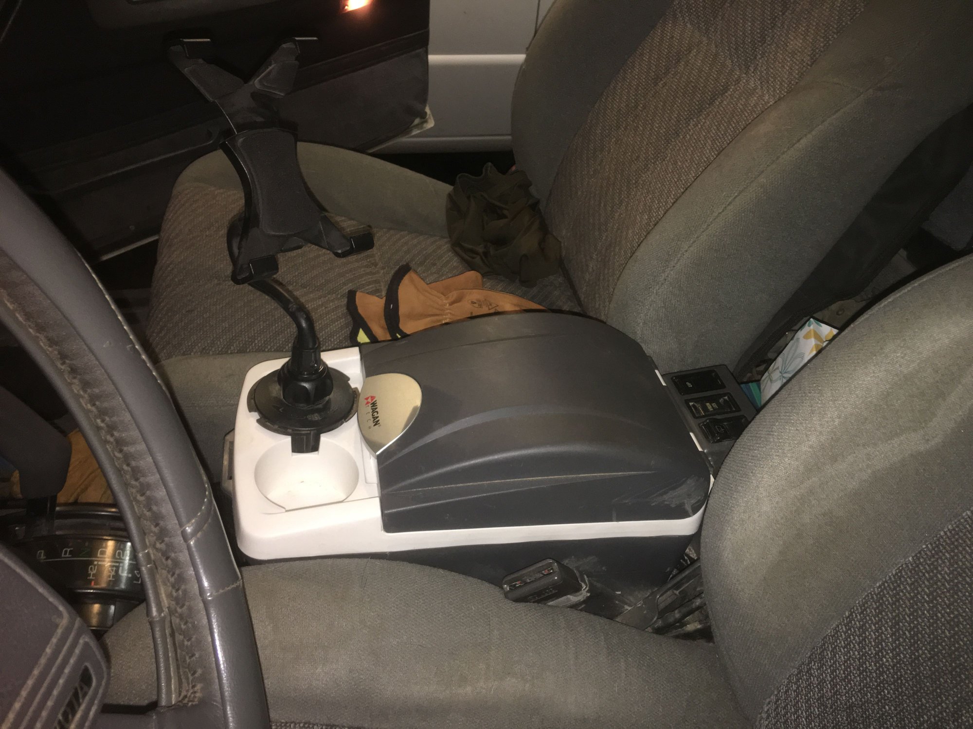Removed the center console and installed an electric cooler. I also relocated the rear window switches to the rear of the cooler so I can reach them from the sleeping platform.