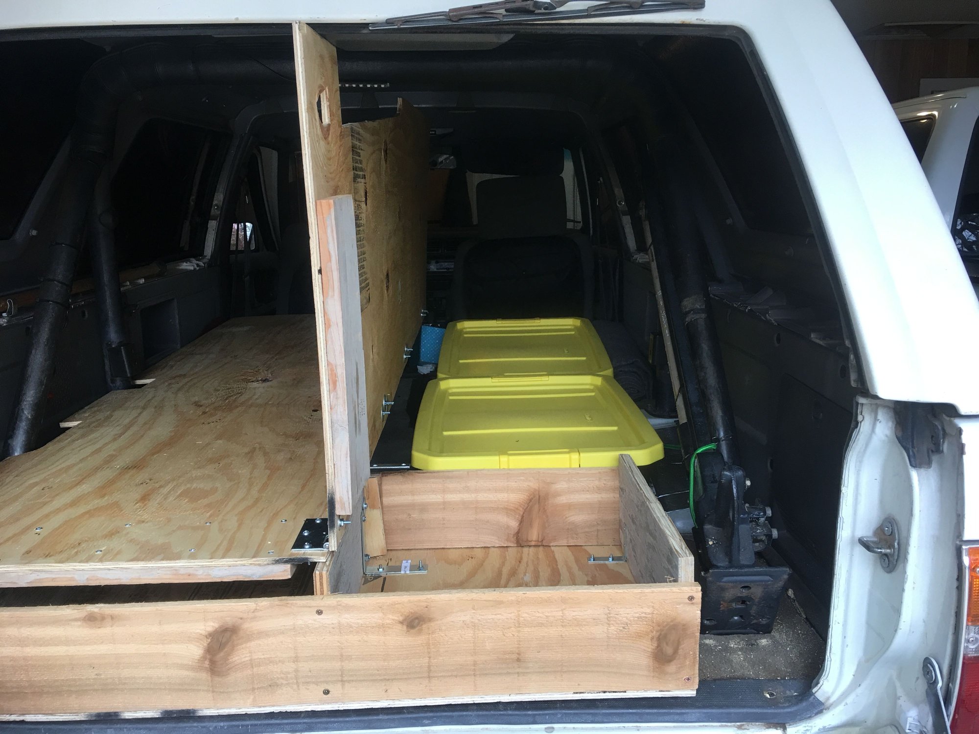 Made a folding sleeping platform for the rear with under storage and one drawer.