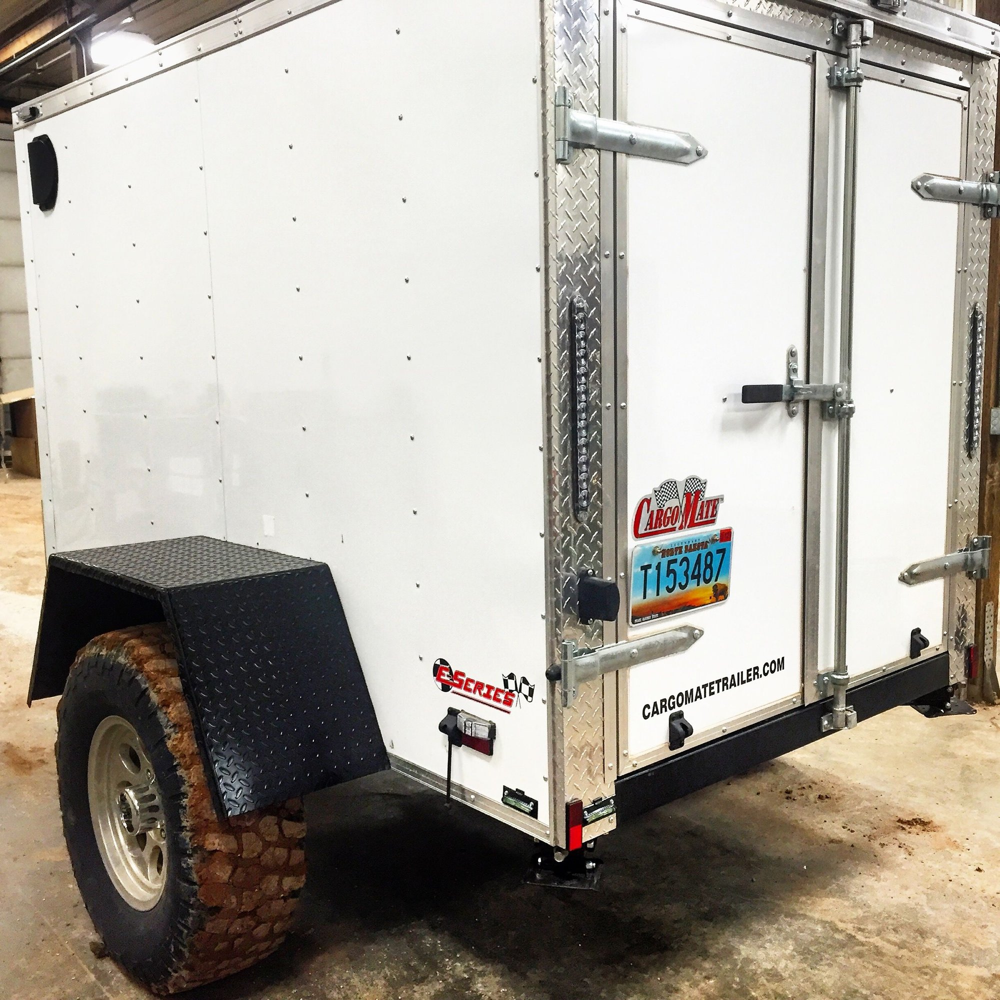 5x8 enclosed trailer with v-nose, side door, and double doors in rear