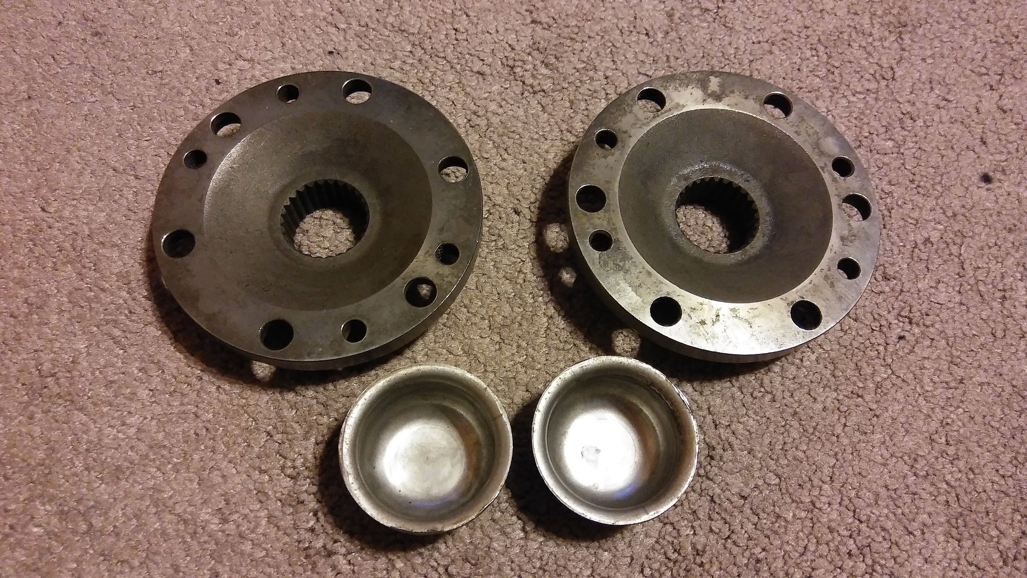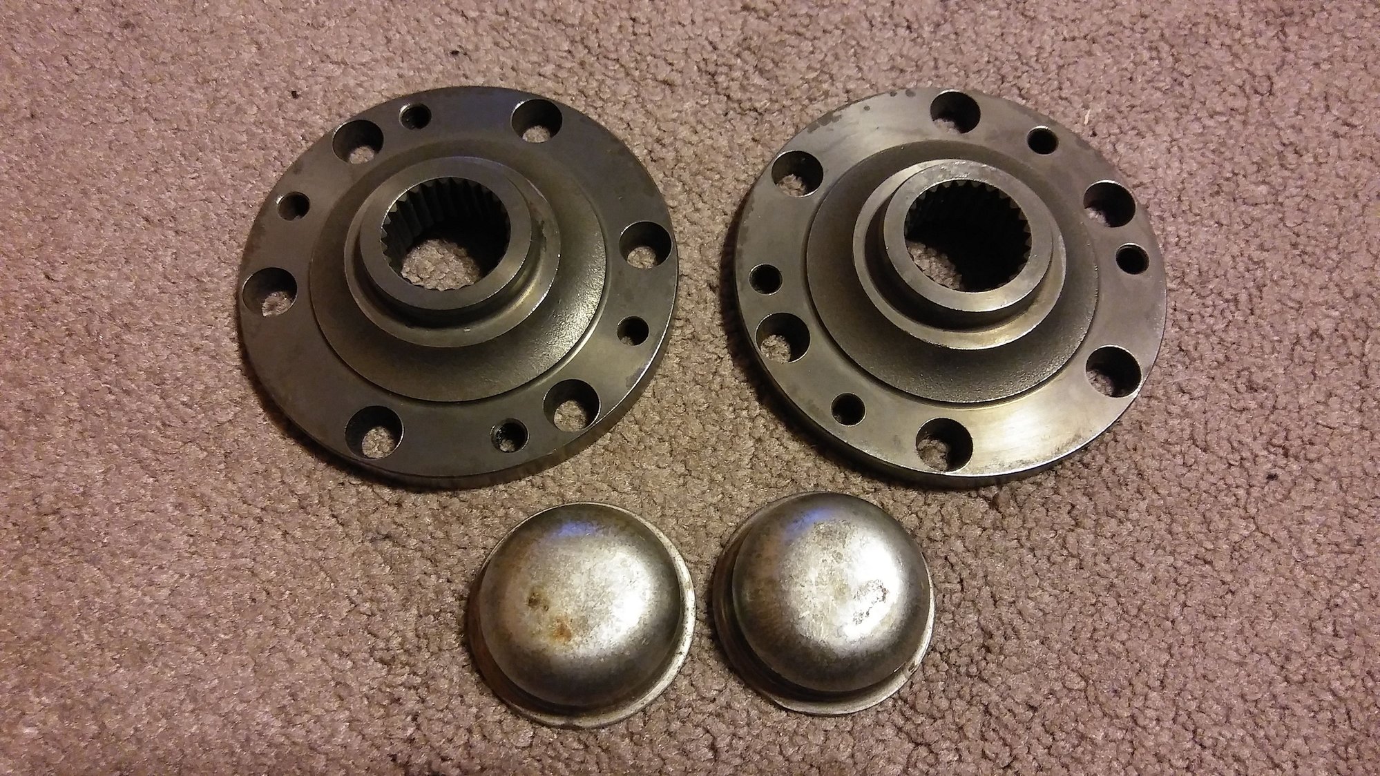 Factory IFS 27-spline front axle drive flanges & dust caps. Doesn't include nuts, gasket, or cone washers. Took these off my old 93 pickup when I switched to Aisin hubs. Will fit any 86-95 IFS Pickup/4Runner. Price lowered to $15 + shipping.