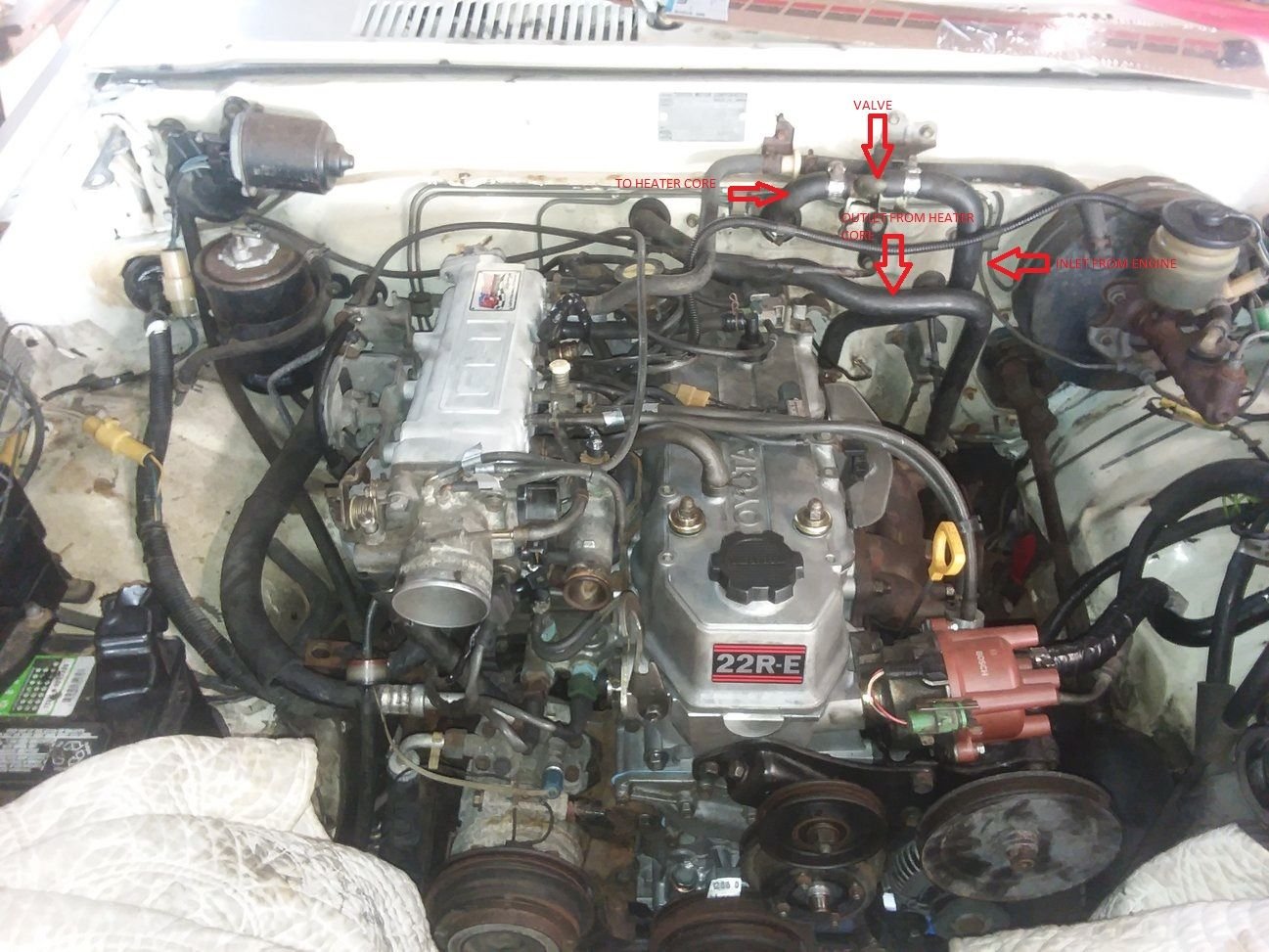 The inlet side on the firewall is the one connected to the control valve mounted right there on the firewall. Water comes up, goes through the valve (if it's open, of course), through the firewall, through the heater core, then out through the firewall, and back into the main system.