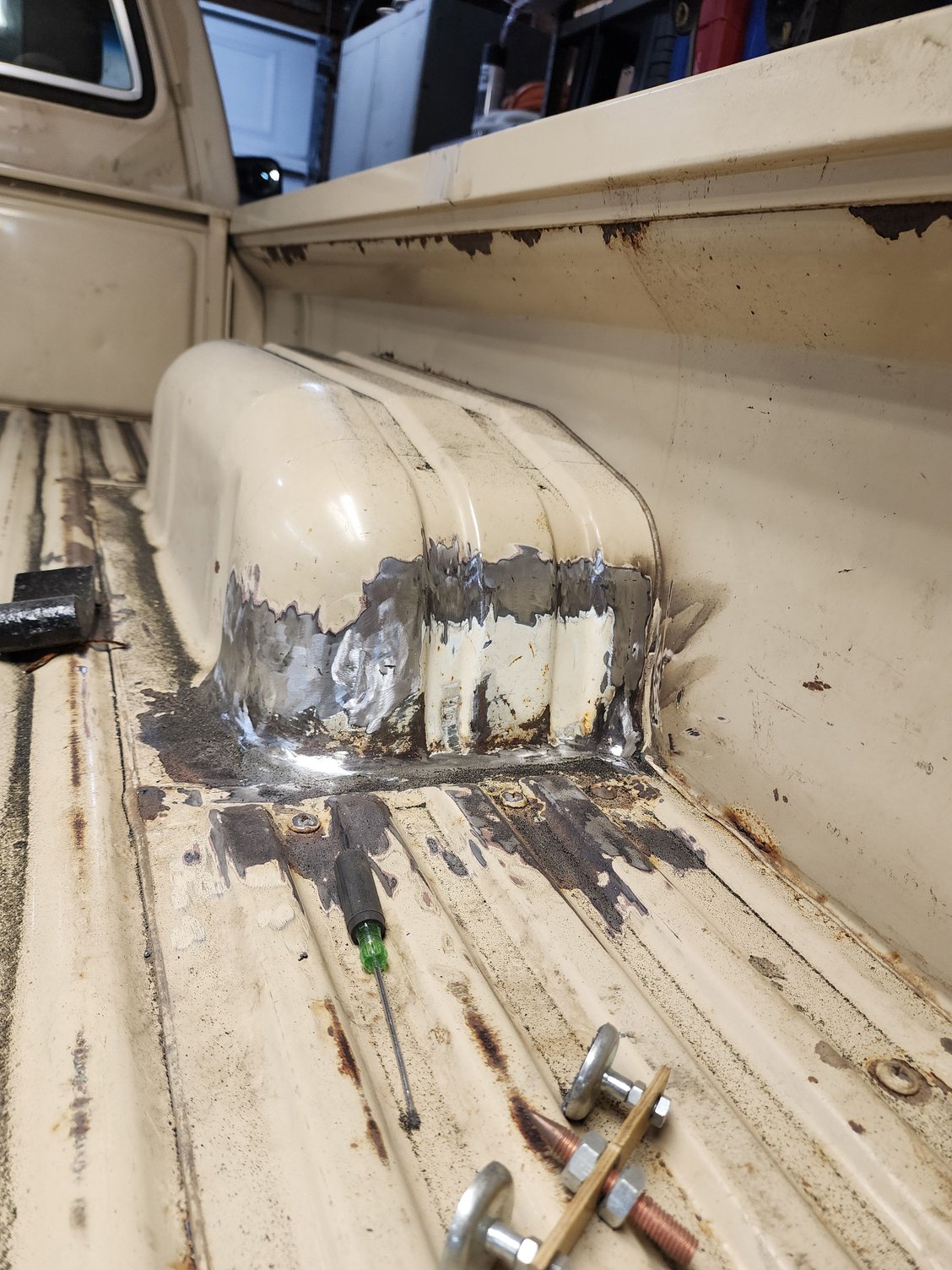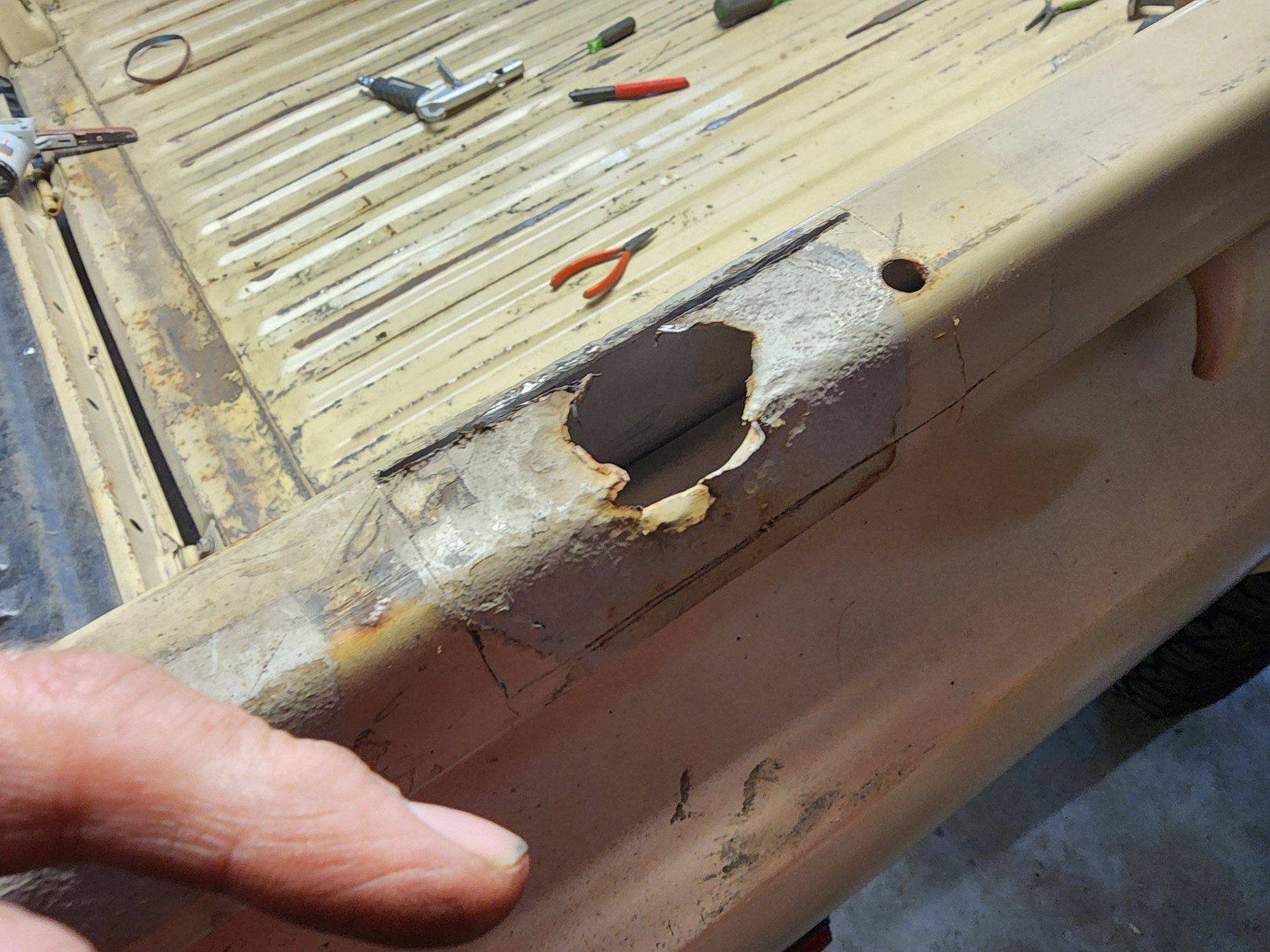I'm finally about done with the patching. It seems the tailgate skin has broken the pinch welds to the inner panel. I can't think of any other fix than to drill through the skin and plug welding it to the inner. I'm going to think it over before I start drilling. I can't think of any other solution.