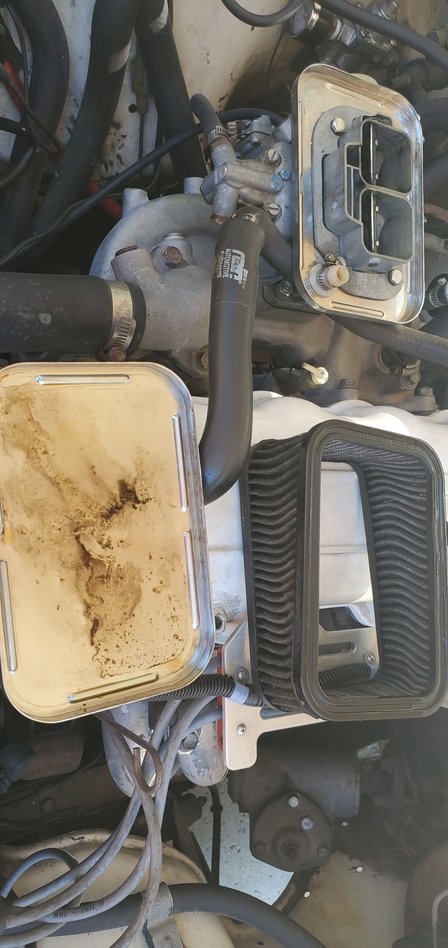 Those are two good points about flooding. I do have to floor the gas peddle to start it. The longer I wait between running and re-starting the better it starts, maybe also cause the truck cools down. I have the kit and Im going to tear into it this weekend. As far as spacer go I do have one but the instructions do not mention anything about that for this truck. Im running an electric fuel pump, I also have a fuel pressure regulator installed, running 3bar, Which is the recommended pressure for this carb. Once I open the carb this weekend im going to take tons of pics, I don't know what Im going to find the carb is 6 years old, some gaskets are leaking there is a stain on the intake manifold form the gas leak. As you can see in these pics.