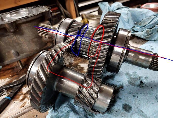 Heres the low range gears from the side from the last time I broke them. Power comes in on the left and spins the low range set. The collar either hooks on to the input for 1:1 (blue line and circle) or through the gears for the 2.28/4.7 reduction. (redline and circle)