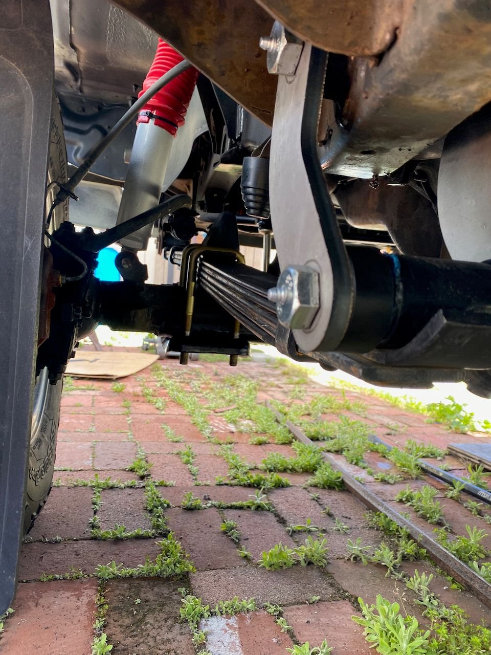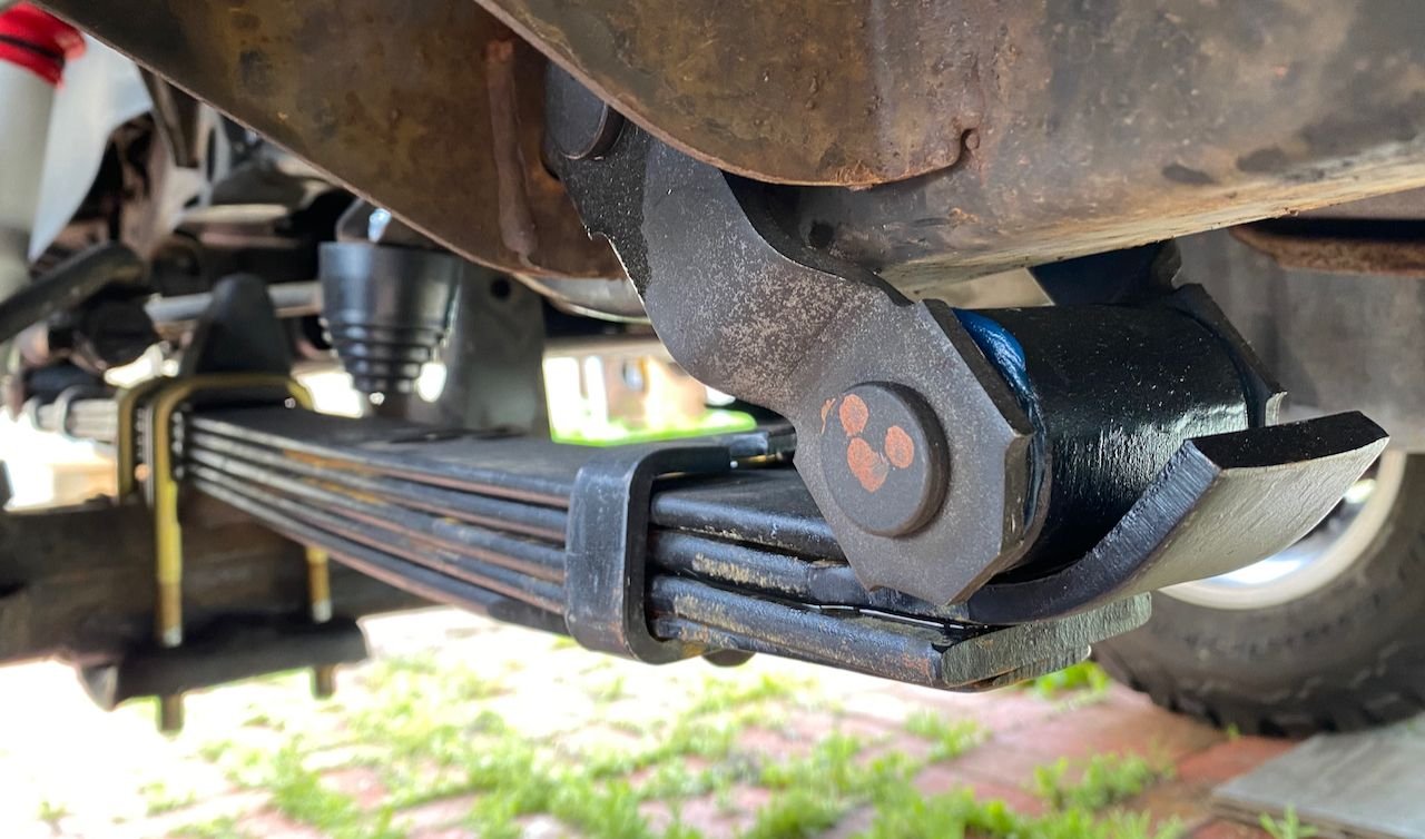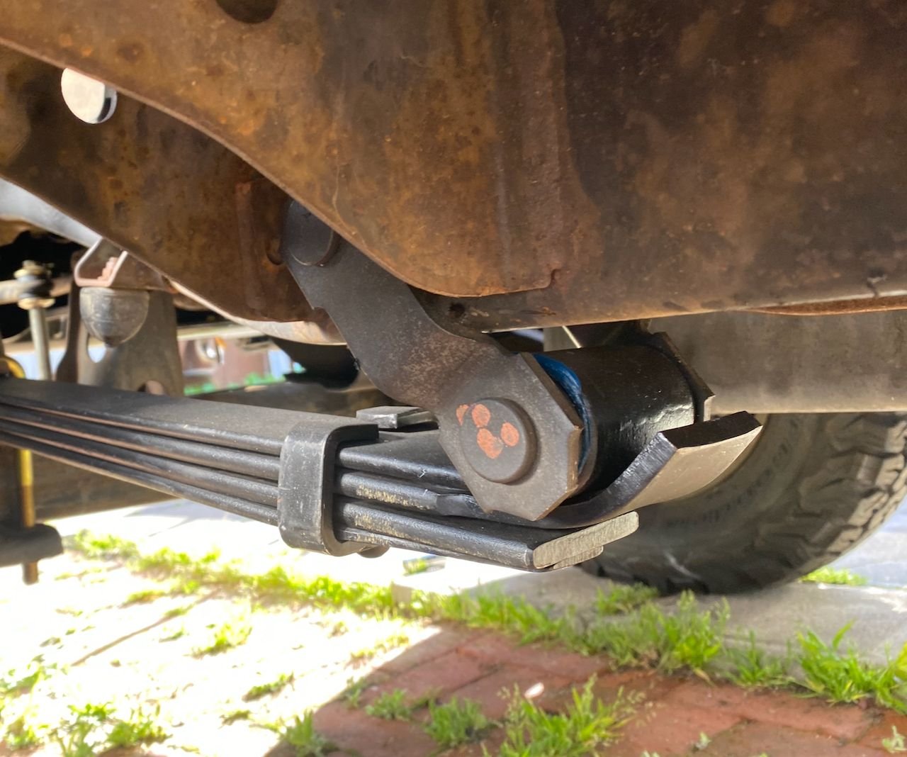 I ordered set pair of front springs from Alcan, they are 4/5 weeks out. So now having my old leaf springs and these new JUNK LC Engineering/Dayton Parts springs I thought I had nothing to lose.Get some service out of them until new springs arrive, add a leaf and see what happens. A fare amount of work and the added leaf gave a 2" increase at the bump stops and a 1/2" clearance between frame and shackle. That is until I drove 50+ miles during which the two main leaves negative arched more. Both spring packs collapsed down to 1" bump stop clearance and the frame was riding on the shackle again. Metal must have not been tempered to spring.