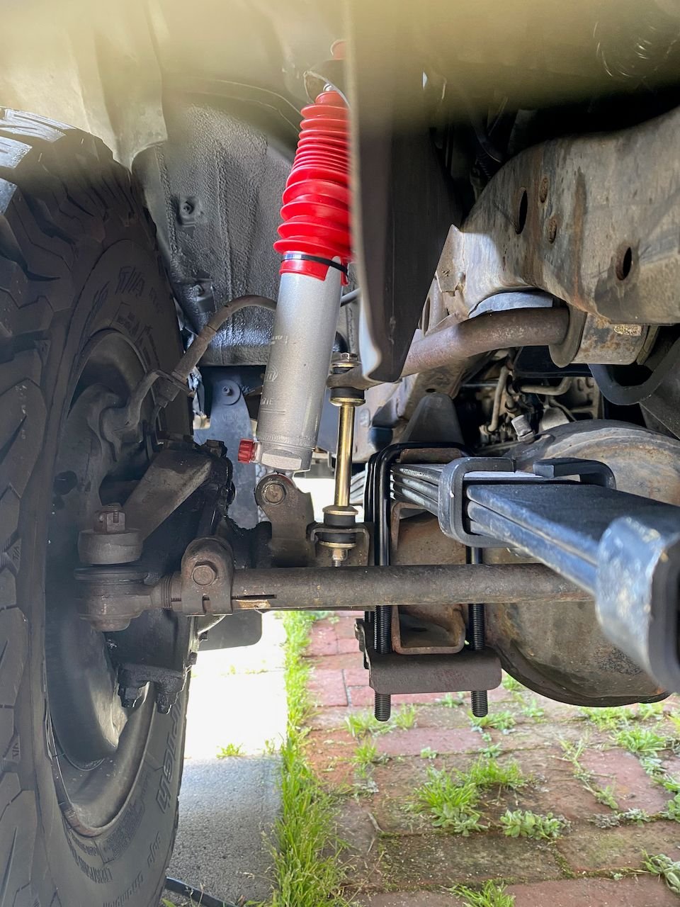 Now knowing from my personal experience, My OEM spec Alcans and Sky's shackles are expensive, have an okay ride on the street and are close to having the front to back look level but springs bottom out easily. I recommend Old Man Emu 2" lift springs, stock shackles and remove one of the short leaves to get a I"ish lift and softer spring rate. I don't believe the ride would be much different than what id did but the money savings is huge.