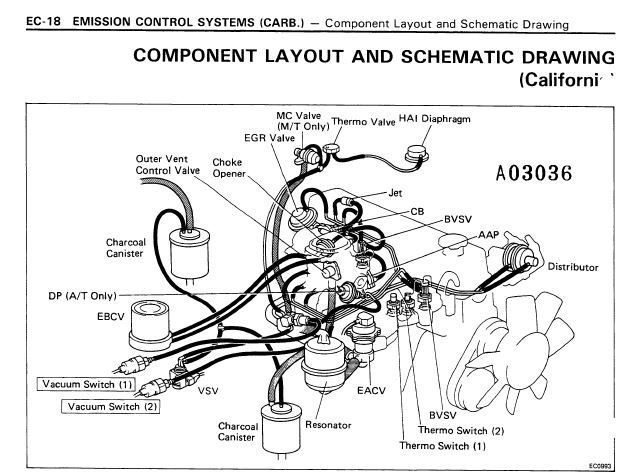 I dont think there is a big difference between Cali/Fed/and Canada models in the 85 year. There is a bigger difference in the early 90s models but not your year if I am correct. The VSV on the rear of your valve cover is what controls flow of the fuel. That is the one you need to make sure is correct. i have not heard of the kit you have bought and not sure what it does. You should have the pcv hooked up as far as I know, not sure why they want it removed. 1985-87Toyota22RE Attachment 120490 |