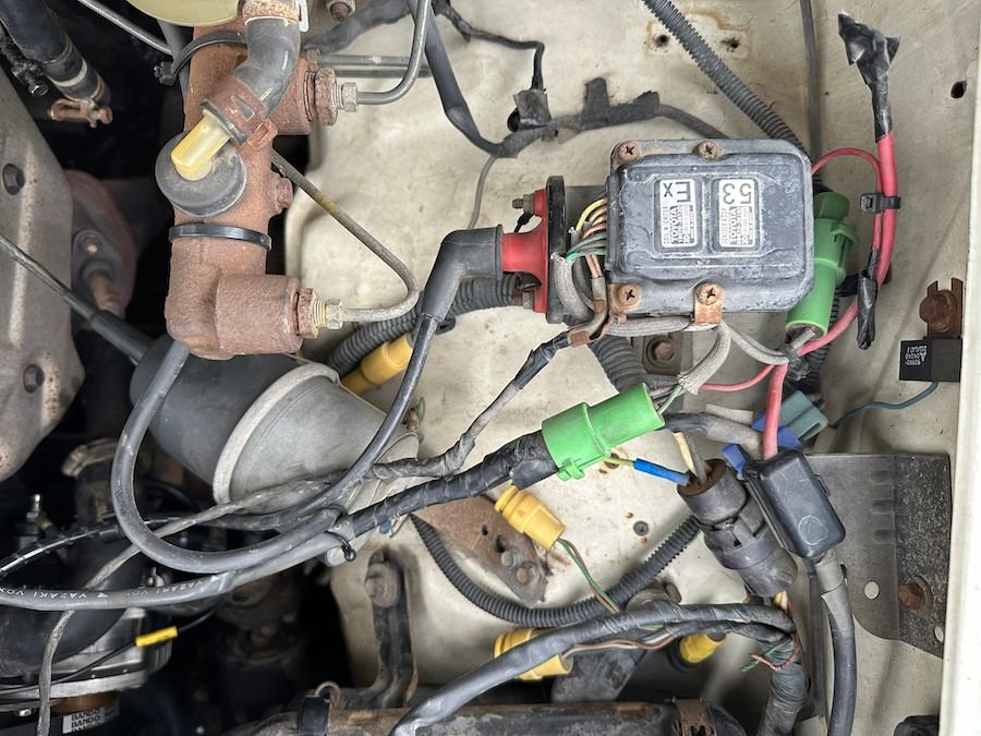 I am looking to replace a wire. The top wire it runs from the Ignitor Assembly (photo with black tape on wire) over the valve cover (silver duct tape) to the upper & lower intake (haven't tried to look here because that's where the problem lies). I bought the Moho in Palm Springs. I have driven it 8000 miles since. No issues beside the expected oil leaks. My mechanic just rebuilt the front end (timing, water pump etc) and replaced the valve cover gasket. Engine started right up afterwards. I was asking him about the wire in question and moved it and the engine died. It started right up and we moved the wire again and it died again. We decided not to do that any more. I would like to replace the wire but not until have the replacement in hand. I have had no luck of anyone knowing what this wire is. I would hate to replace the whole harness if possible everything else works perfectly. Does anyone know what this wire is? Is it available or can it be made for me. I would appreciate any help you can provide. Thanks for your help in advance.