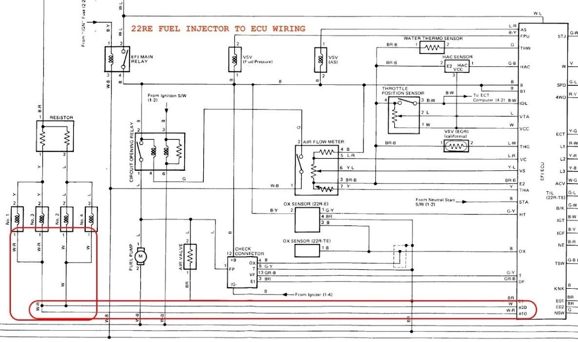Check wiring between NEGATIVE side of injectors to ECU pins 10 and 20. There are crimps that jump all negatives together which get corroded/easy to break:
