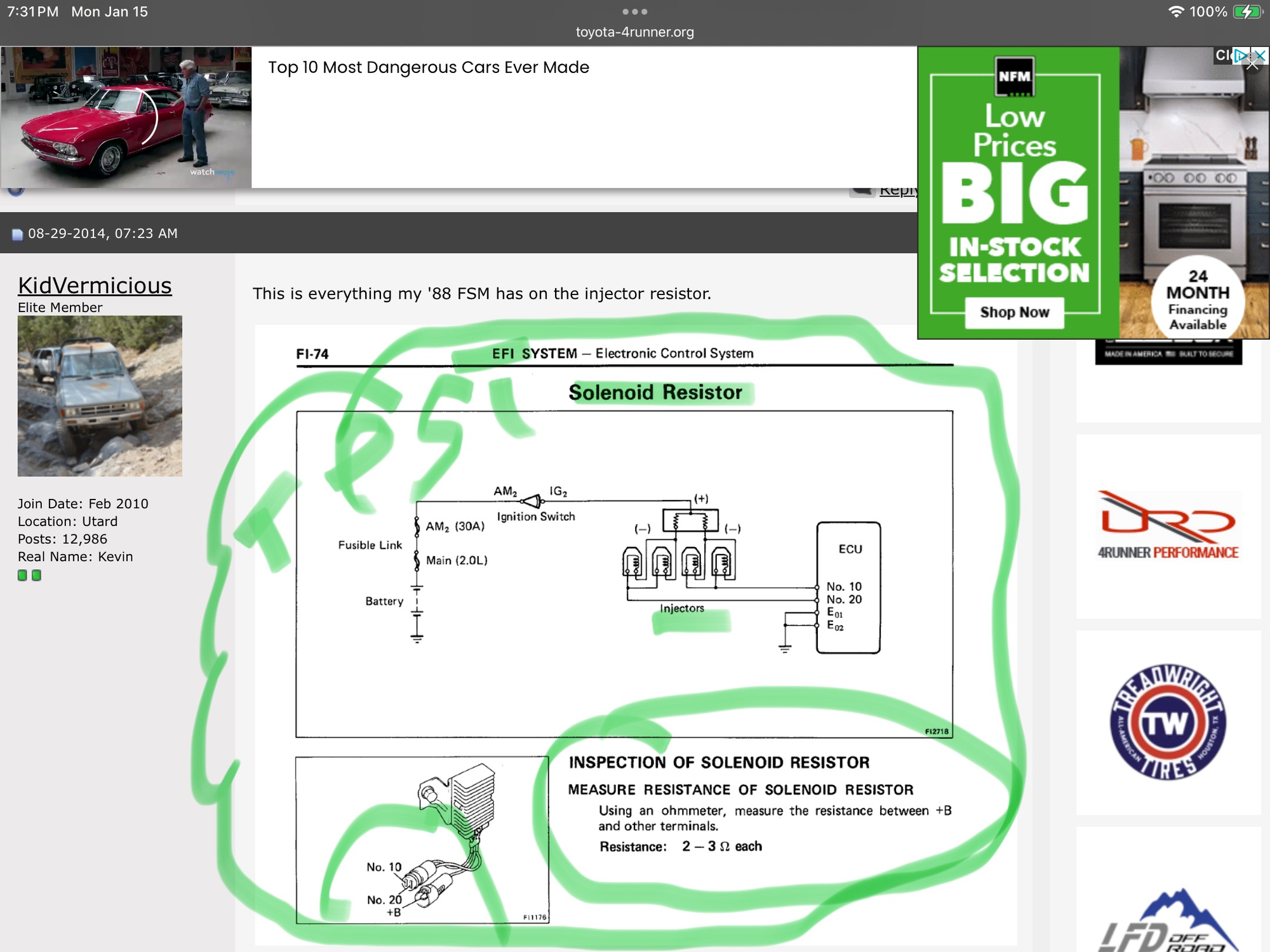 88 dlx, 22re, at. Was running great, took off from a stop light and it quit . Checked compression, timing, has spark, AFM good, igniter good, injector resistor good, fuel pump good, cor good, new plugs wires, ignition coil, new distributor, and the ecm is good. Took to local imports shop and they could not solve. Grounds under hood all check good, fuses good. I jumped go and fuel pump works . Cold start injects fuel, fuel filter is ok. Fuel pressure is good. Auto shop said injectors will not continue to spray after cranking, will start for 2 seconds. Then die. There is a code 14 but after extensive research and forum suggestions all possible parts check out good. Only thing left is a broken wire?? Fuses all check out good too. I’m loss, what could to the problem. All help appreciated. Thanks Yotatech!