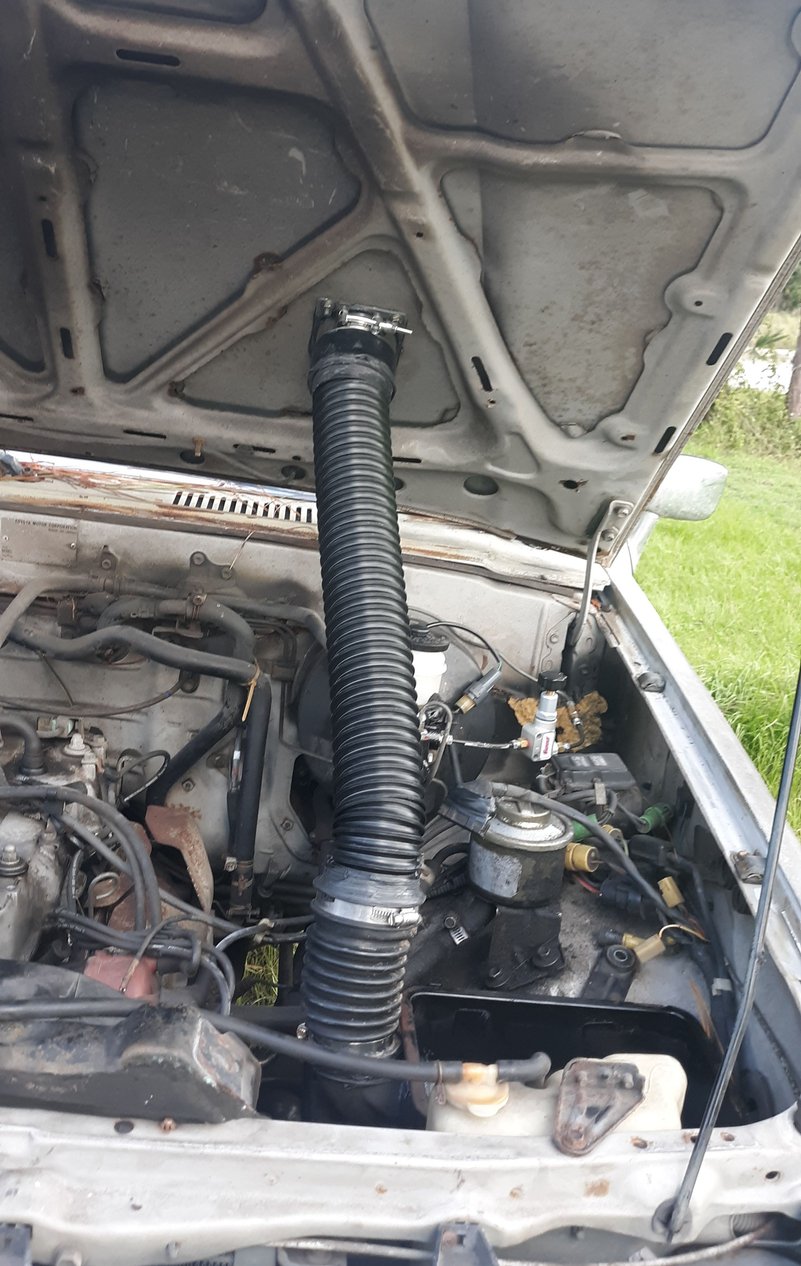 Got started on my snorkel today. I live in florida so when we do trail ride theres lots of water. So the plan is to run a hummer style snorkel. I ordered a top from river raider then grabbed some flex hose and some other pieces I had laying around. My air inlet (the part right behind the grill that goes into the bottom of the airbox) was trashed and held together by ac vent hose. So I cut it down to make a 45 and mocked this up. Going to silicone everything up once the top piece gets here.