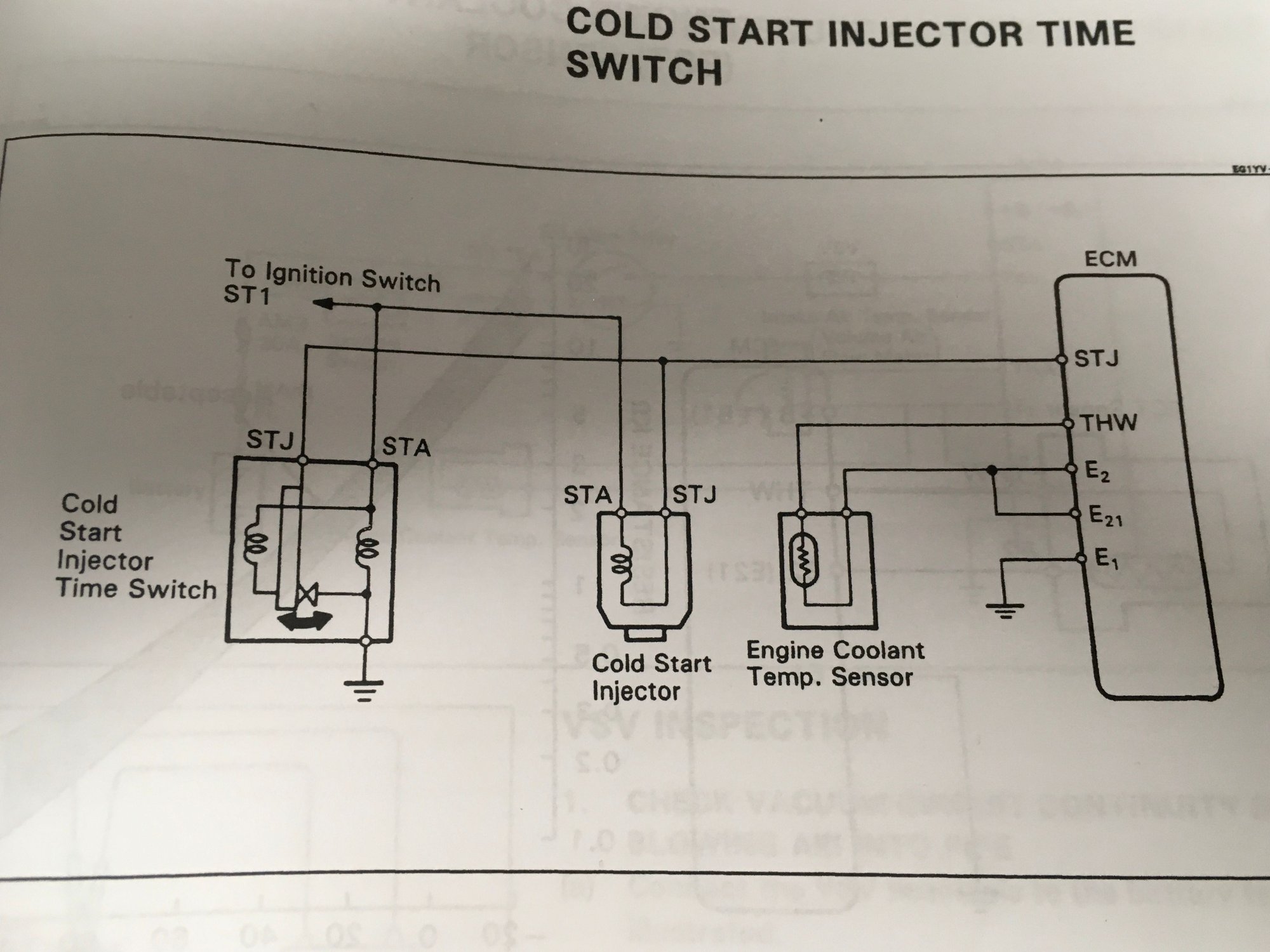 I’m having trouble starting my 1995 Toyota pickup 22RE first thing in the morning when cold, and while after sitting awhile. I’ve tested the cold start injector and it sprays fuel when given 12V and ground via test leads from battery. The fuel pump is pumping fuel to the rail, very well and pressure is ~33 psi at idle when it does run (with fuel pressure up vsv in play), without FPU vsv fuel pressure is in spec as well. The Thermo time switch (all 3 that I have laying around over the years) test good. The cold start injector itself tests (Ohms) out good as well. What I need to verify and check, is that the thermo switch AND wiring is actually carrying the signal to the cold start injector. From what I understand, the time switch completes the circuit via ground while cranking allowing the cold start injector to fire... but I could be misinformed. In any case, I need someone who’s good at electrical on this system to walk me through how to actually test the pigtails and wiring from time switch to cold start injector or vise versa, as I know the injector and time switch function independently, but that doesn’t help a guy start his ride... unless the two work in conjunction. Here is the diagram from the 1995 FSM.