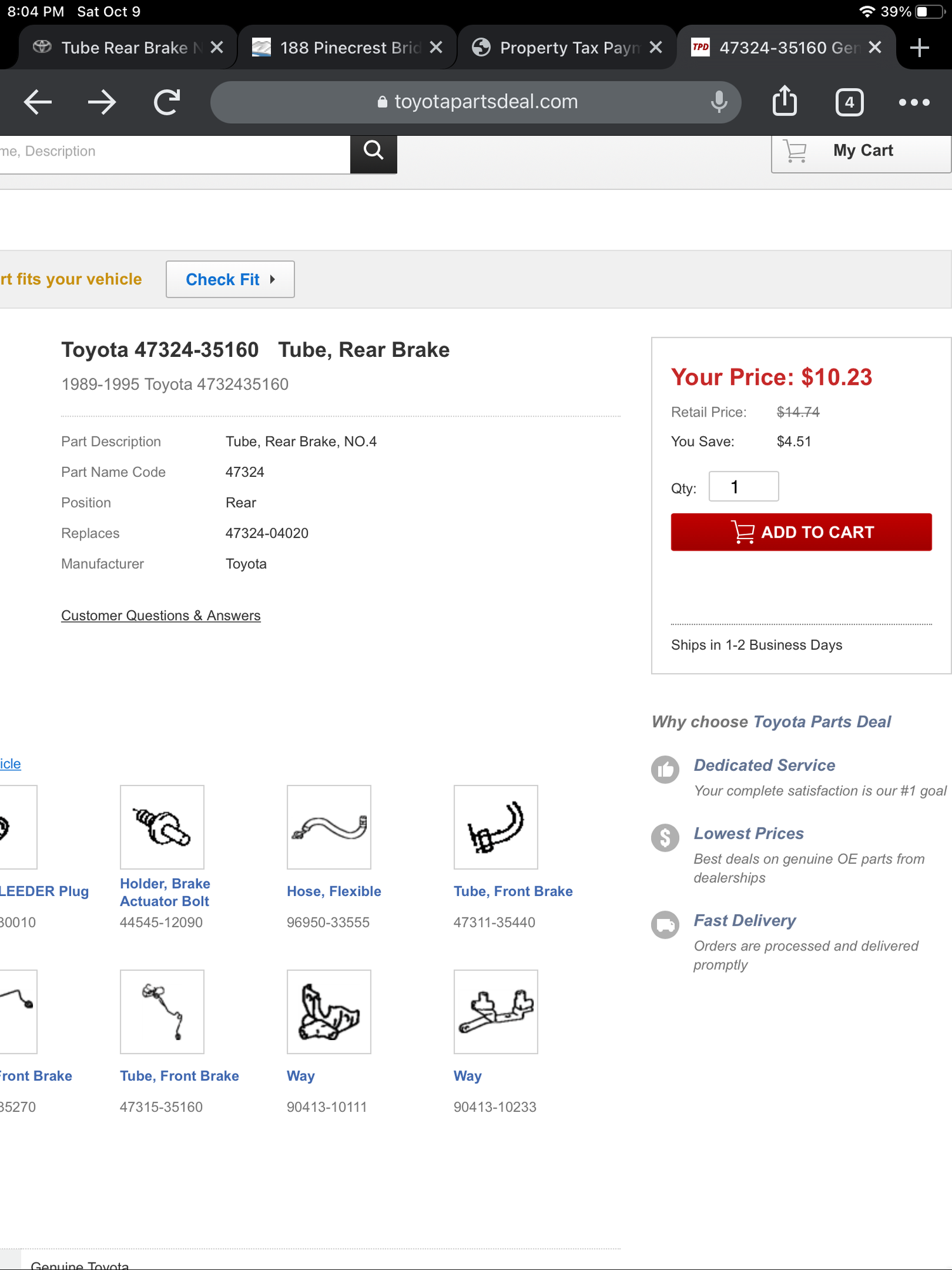 47324-35160. Again, this is the tube from union on axle housing to right rear wheel cylinder.