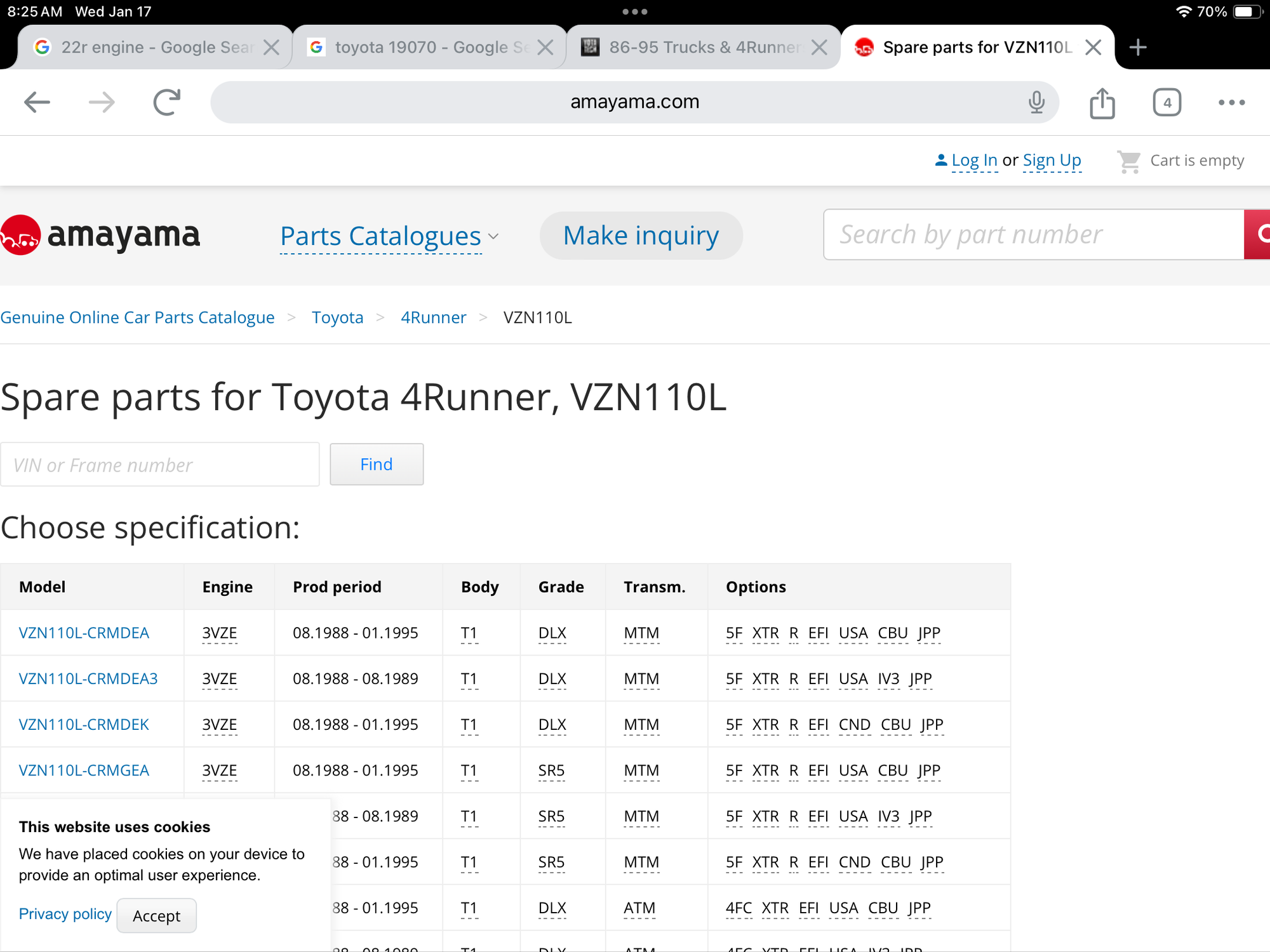 Yours is VZN110L-CRMDEA. there's a wealth of info on that decal about your specific vehicle. Save that photo on your phone. The production date will be useful, too. Your original post didn't specify engine 22R vs 3FVZE. So rather than ask which engine, and get close, the model number will give me the exact one.