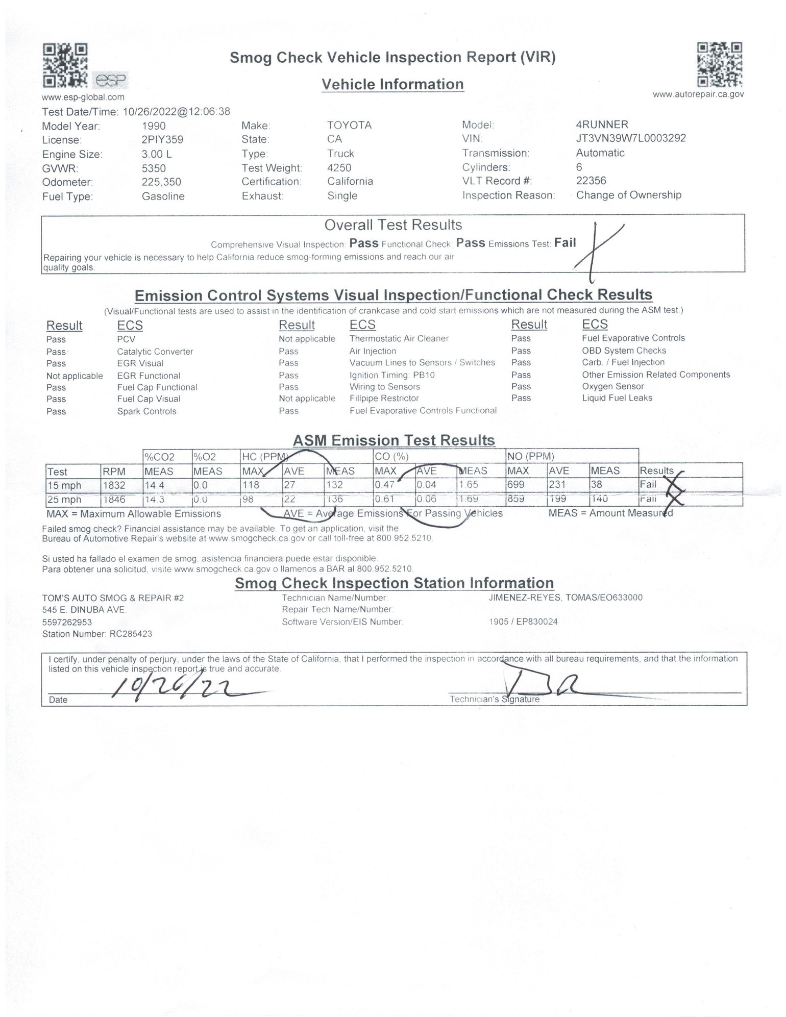 My 4Runner just failed CA emissions and I have no idea what to look for. It passed every other area, just running a little rich but not enough to be a gross polluter. I'm going to post the printout in hopes someone here can give me a direction to go with this thing.