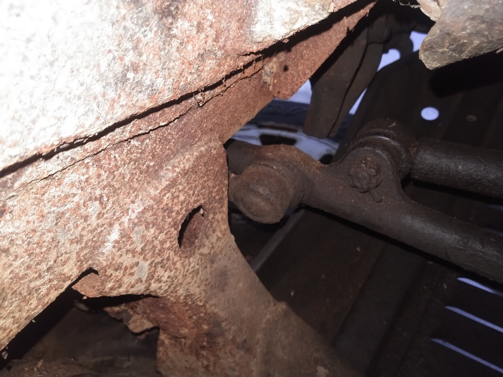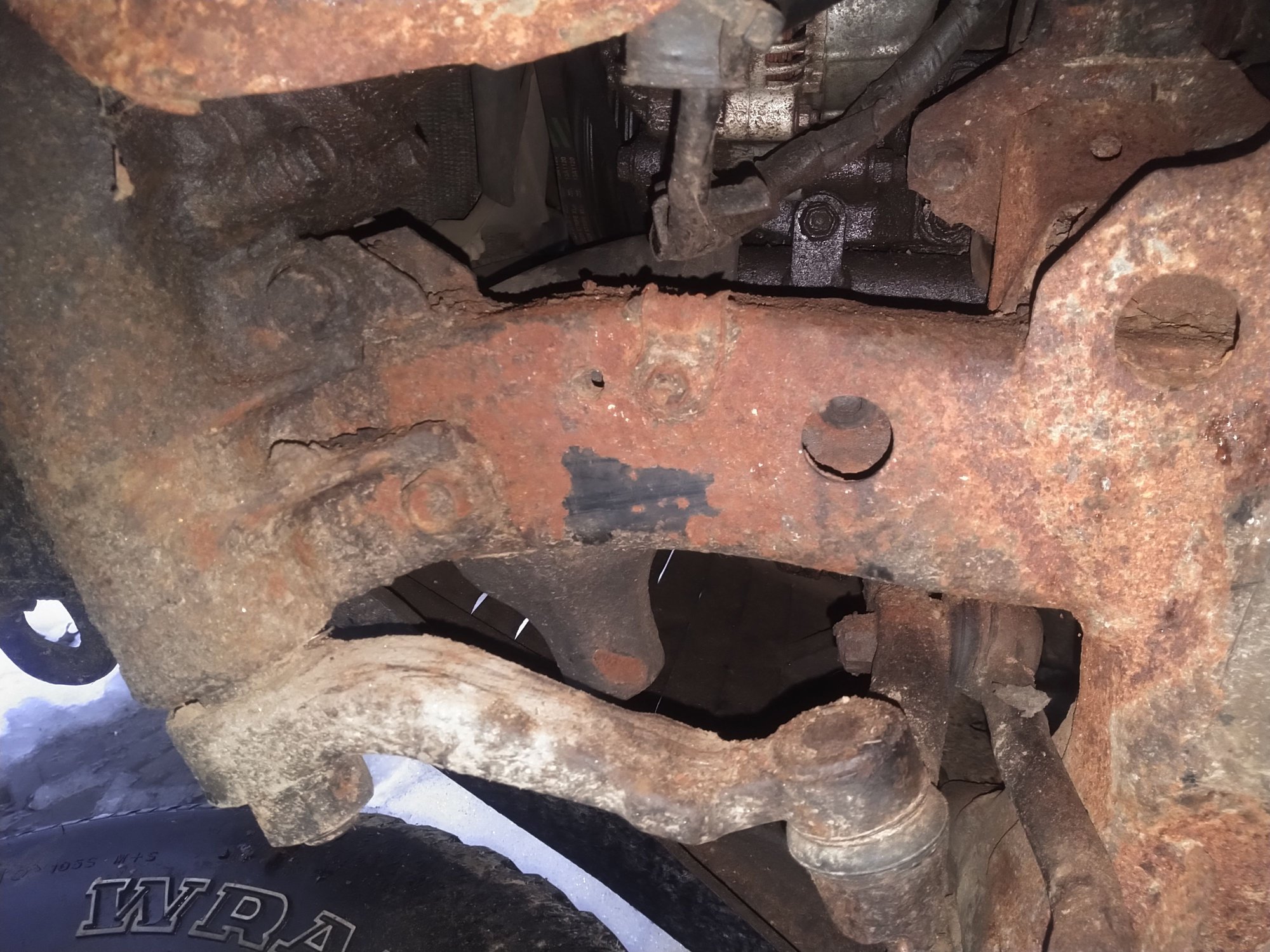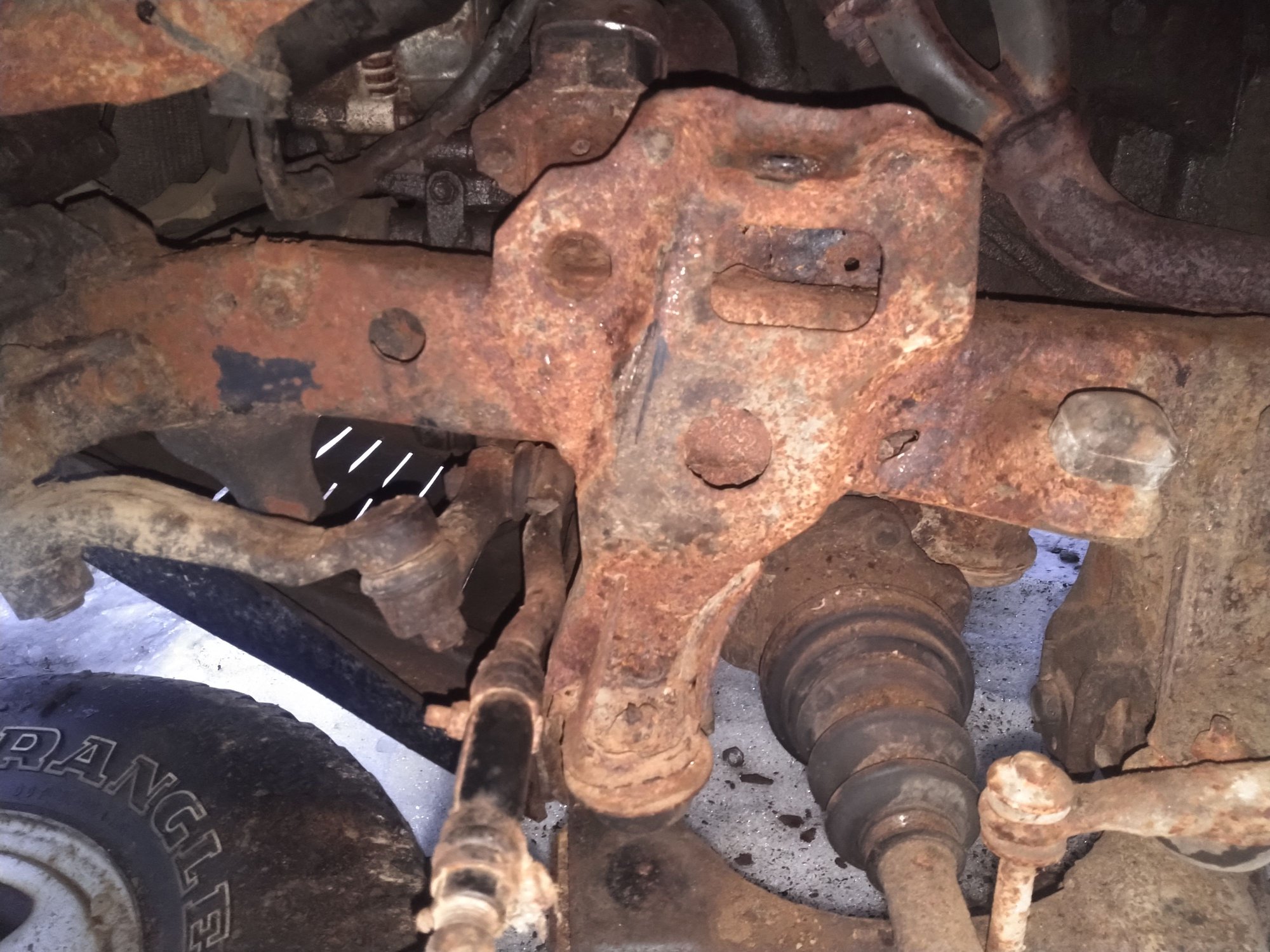 Only real issue is frame damage on the front driver side. The PO was bombing down a farm road and managed to rip the upper control arm out of the frame. While digging around I noticed the rear front differential mount was completely rotten. I think this may be the root cause because the metal surrounding the UCA mount is pretty good. Weldable even.
