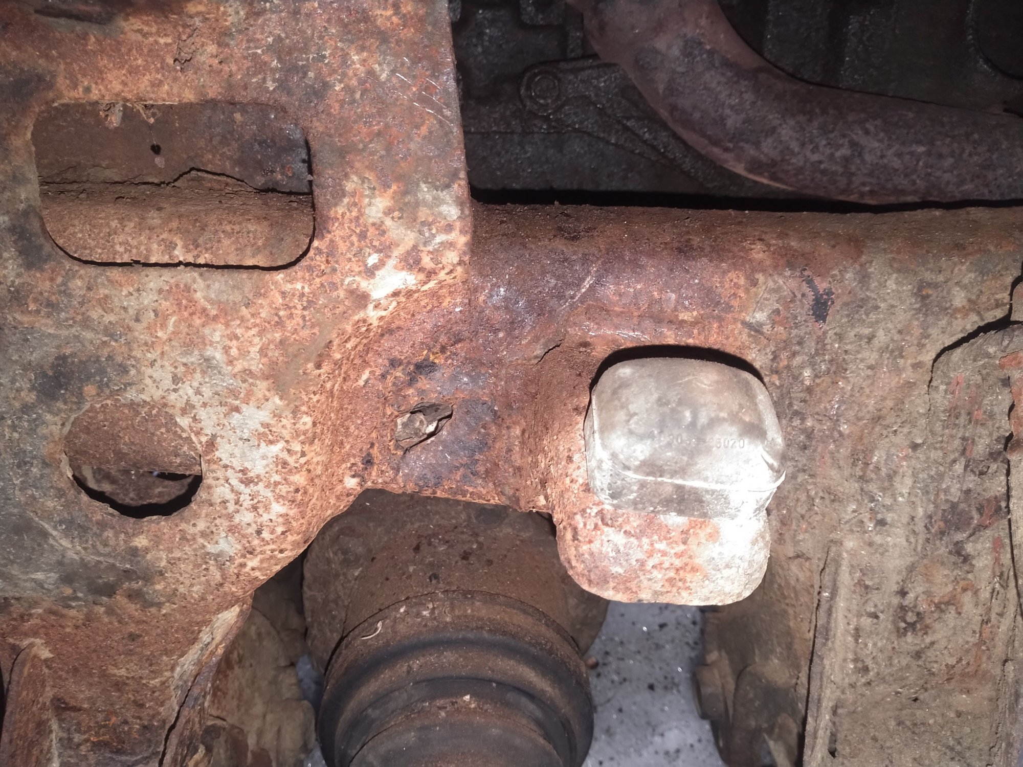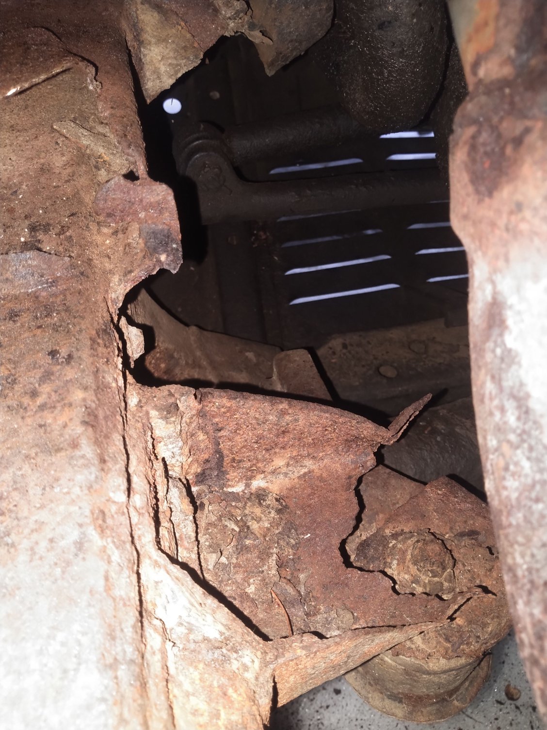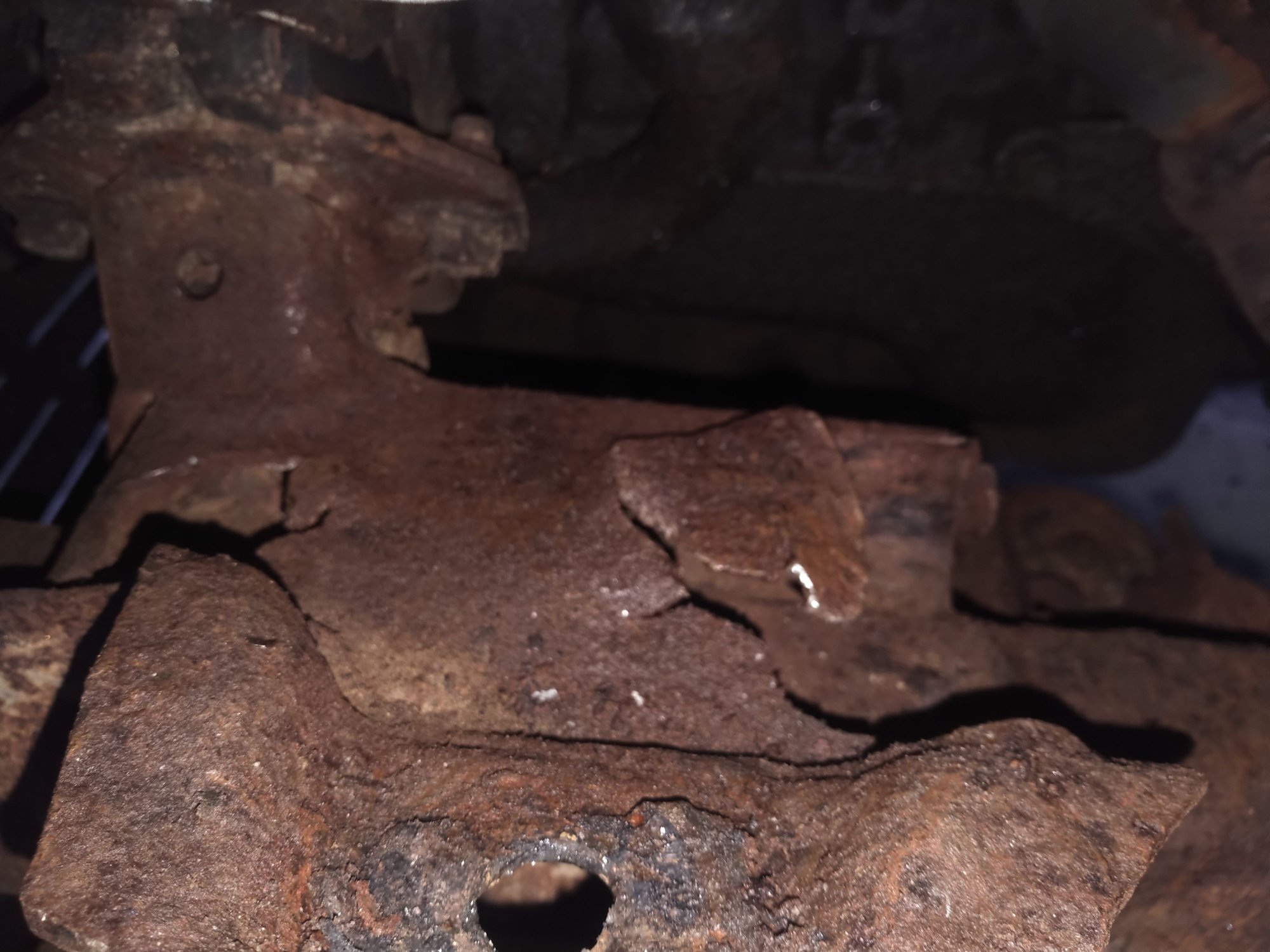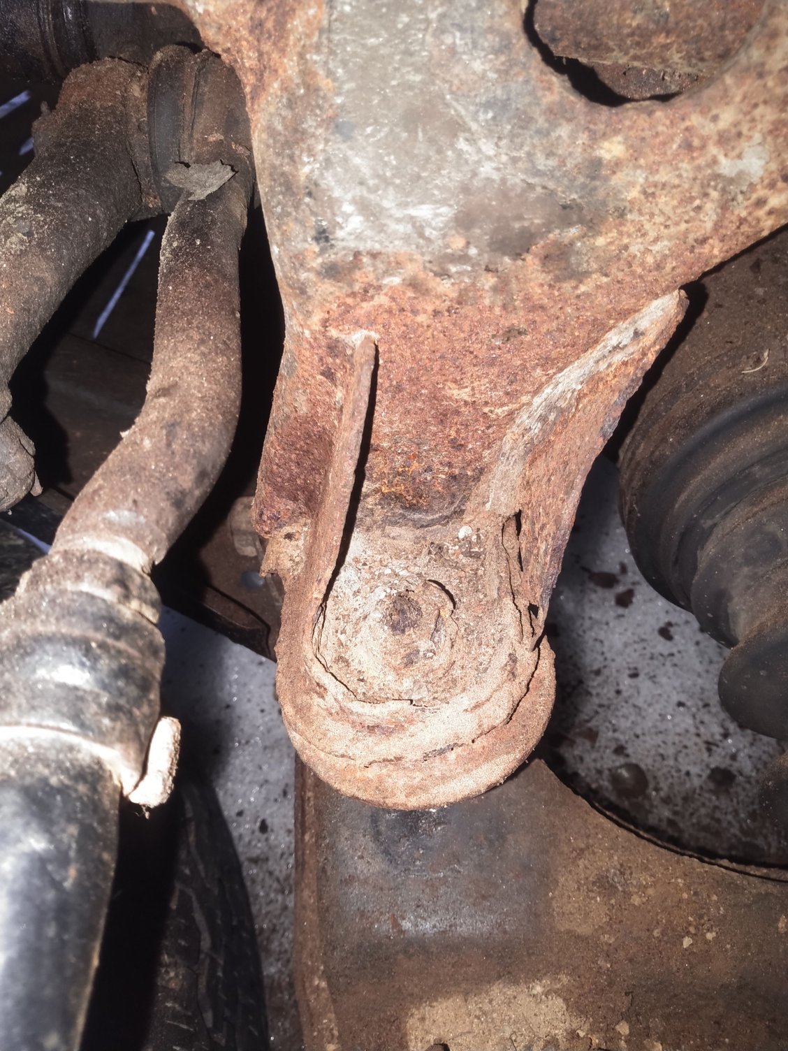 Only real issue is frame damage on the front driver side. The PO was bombing down a farm road and managed to rip the upper control arm out of the frame. While digging around I noticed the rear front differential mount was completely rotten. I think this may be the root cause because the metal surrounding the UCA mount is pretty good. Weldable even.