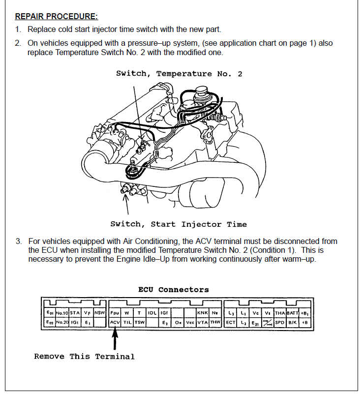... The cold start injector switch (89462–20050) comes up as still available and is $111.33.All other suggested tests are free and will be legitimate diagnosis as to what's wrong and where to spend money.
