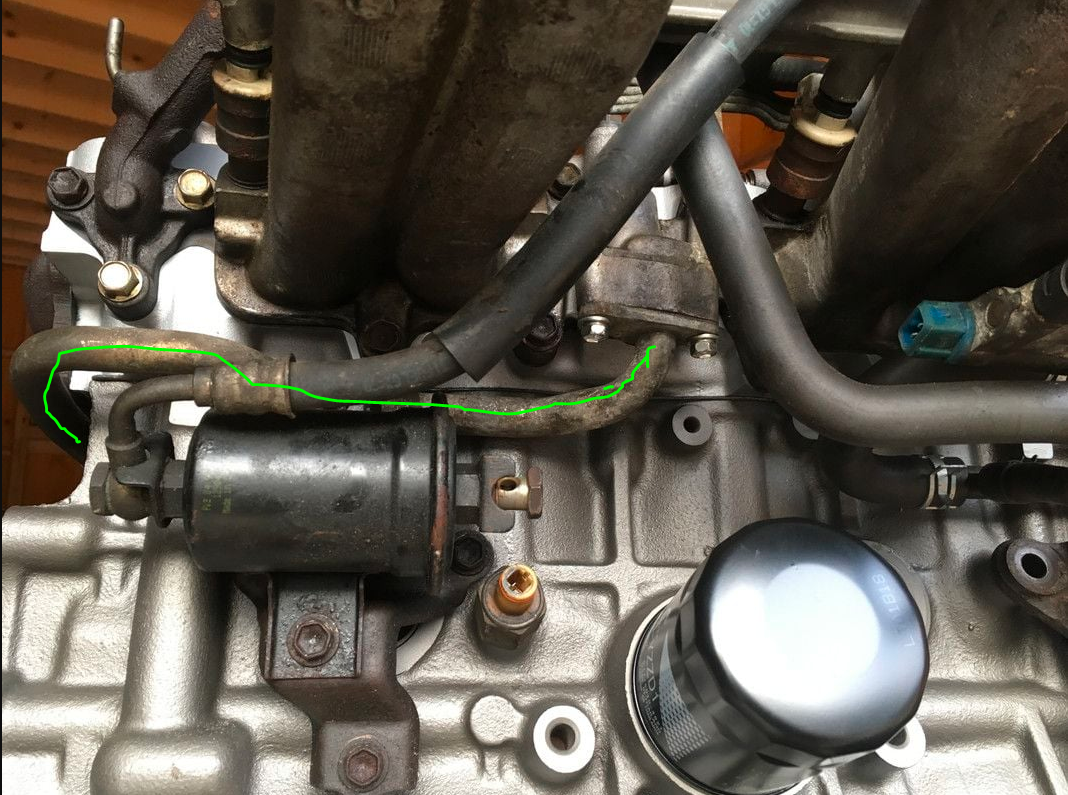 if you are getting coolant on top of the intake runners, that pipe i showed can't be the source. for that, i'd suspect the temperature gauge sending unit, which is buried down in there, mid-way along the head. best shot i have of the gauge sender. the male-terminal blade is visible at the base of injector #2 (just above the coolant bypass hose)