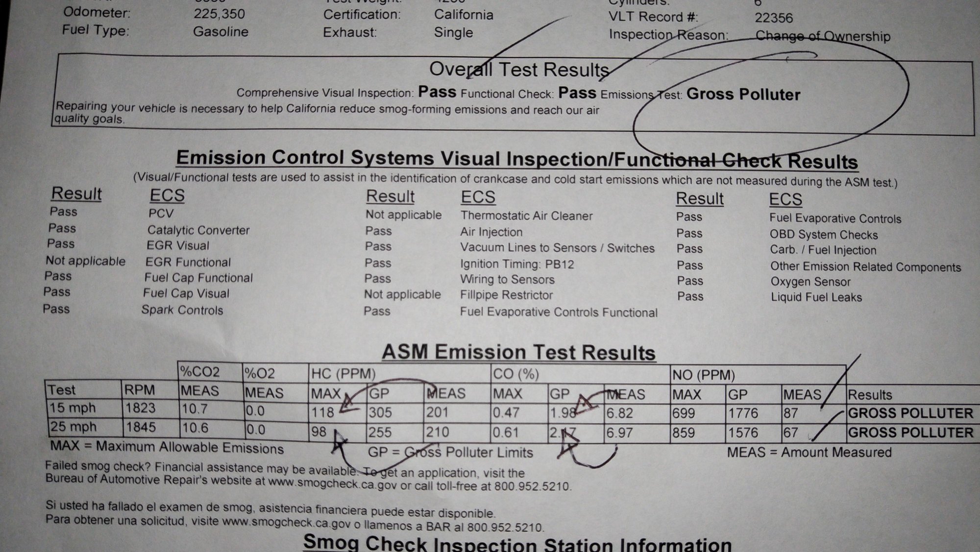My HC (PPM) was measured at 201 at 15 mpg and 210 at 25 with the maxes allowed being 118 and 98 respectively. Similarly, CO (%) measured at 6.82 and 6.97 where the max allowed are .47 and .61.