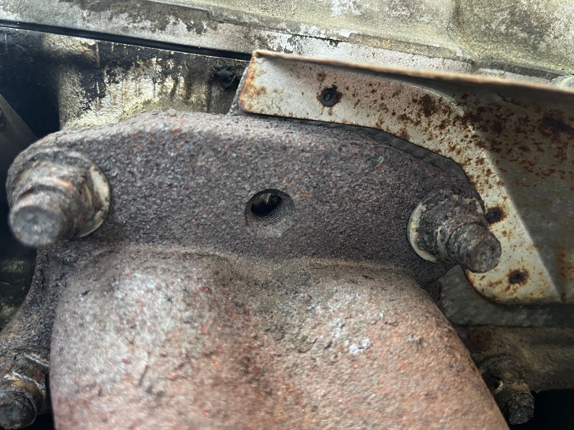 Another question - where the head meets the block, the head gasket seems to have "squeezed out" (you can see what looks like gasket material to the right in the image). From what i can tell, the head and the block does not have completely straight sides from factory, but rather some "curves" in it? Sort of looks like the HG has broken apart where it whas "outside" of the block/head from factory, if that makes sense? Problably from exhaust gasket leaking heat. Anyway, i donīt have any symptoms of a bad head gasket, and i have also done the combustion gas in coolant test, but it showed no signs of any combustion. But would it be time to replace it soon by the looks of it? The car only has around 80k miles on it, so feels kinda early for it to give out, all though the truck had been sitting for almost 7 years is before i got it... Here is a picture from below the exaust manifold, taken from the back of the engine (so cyl 3, and 4).