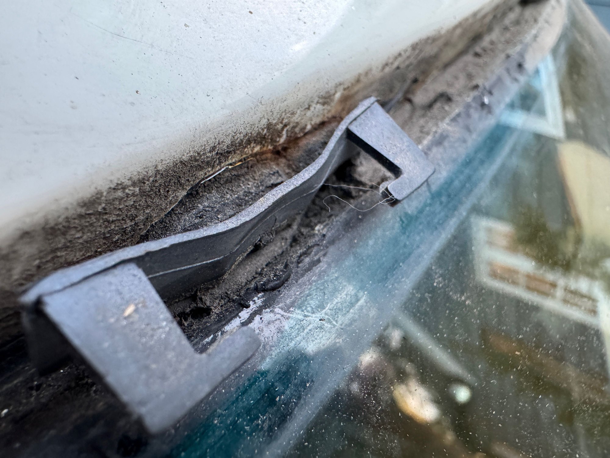 4) Put fresh sealant in the 6 spots where the black clips are going to catch the glass. Then put top molding in to place. Have to push a bit to get the molding to catch the clear white retainer, but once it does it's a pretty bomber feel. I taped it down the windshield for 24 hours just in case.