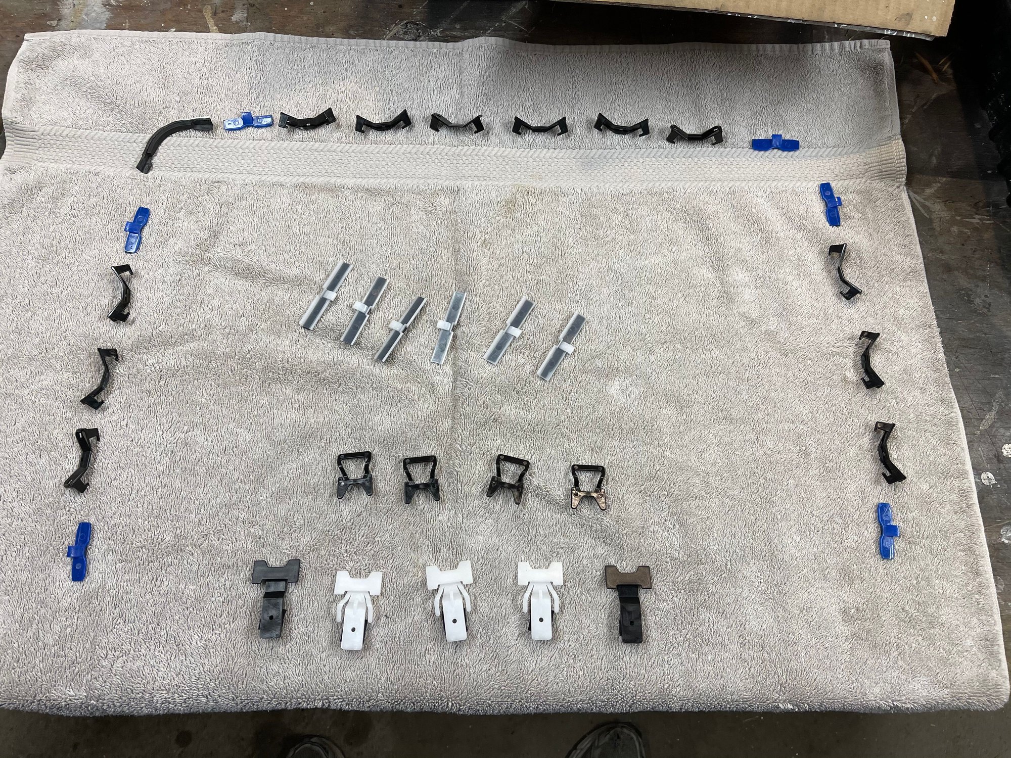 Here’s a photo of the new set laid out the way i see them installed on the truck. There is a curved clip in each upper corner. I don’t know where the white ones in the center go. It appears they could be substituted for the blue ones. Screws only on bottom as Wally said.