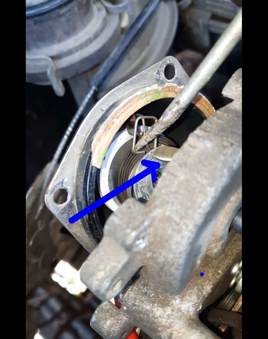 I took the top screws out and loosened the bottom sceew. This allowed me the ability to lean the Choke back. The bottom screw sort of acts like a third hand. I then took a pick and rotated the free moving spring counter clockwise all the way until it hit the coil tab. You will see what I mean, if you ever need to do this. The Carb bracket (blue arrow) does NOT go on the driver side of the coil tab as previously thought. The spring does the part to pull the coil. The Carb bracket goes into the spring "hole" on the Passenger side of the coil tab. It goes where my pick is in the picture. I slowly slid the pick out and the bracket in, as I pulled the choke towards the Carb. It is not that difficult. In my readings I came across a guy from years ago who could never figure this out. They just bought another Carb. Hopefully this post will help somebody out. So far the truck is idling correctly, etc. (Now I've just got my other issues to worry about fixing)