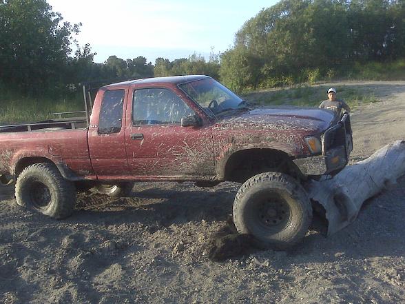 Okay so here is some pics of my yota stuck in a mud hole. My truck is on 35 12.50s that are pretty worn and I have a rear locker. I have made this whole before with no lift and 33 12.50s but it was when it was more of a water whole now its like quick sand because its right by the river. It took my dads 02 f350 and several broken tow straps to get it out and it wasnt easy for the ford. I am going to try it again next weekend when I have my new 35 BFG KM2's.