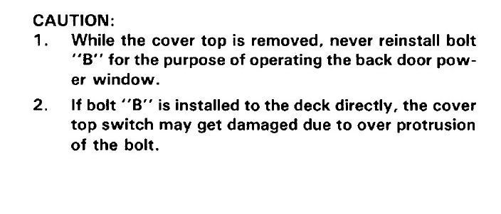 The actual switch is inside the side panel right below bolt B. Driver's side. I believe right behind the roll bar, but I may be wrong about that. So is the whole control of the rear window's power. It takes in the power, and all the interlocks, and permits, or denies, operation of the rear window.