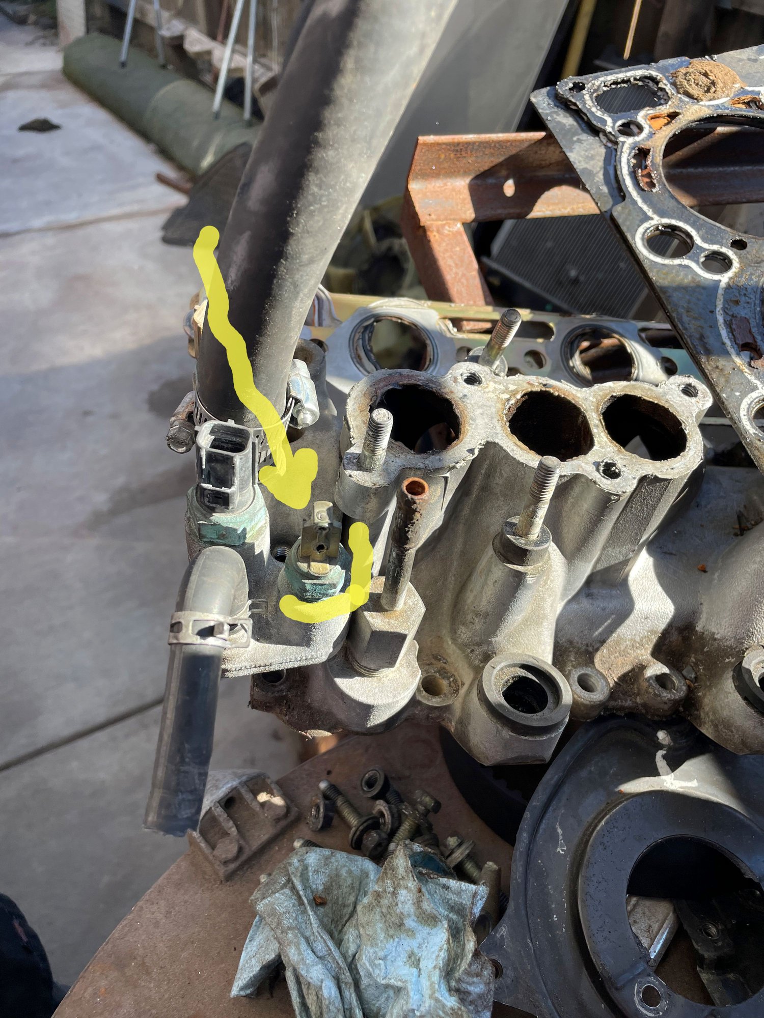 This broken sensor is on the piece that bolts to the back side of the intake manifold.