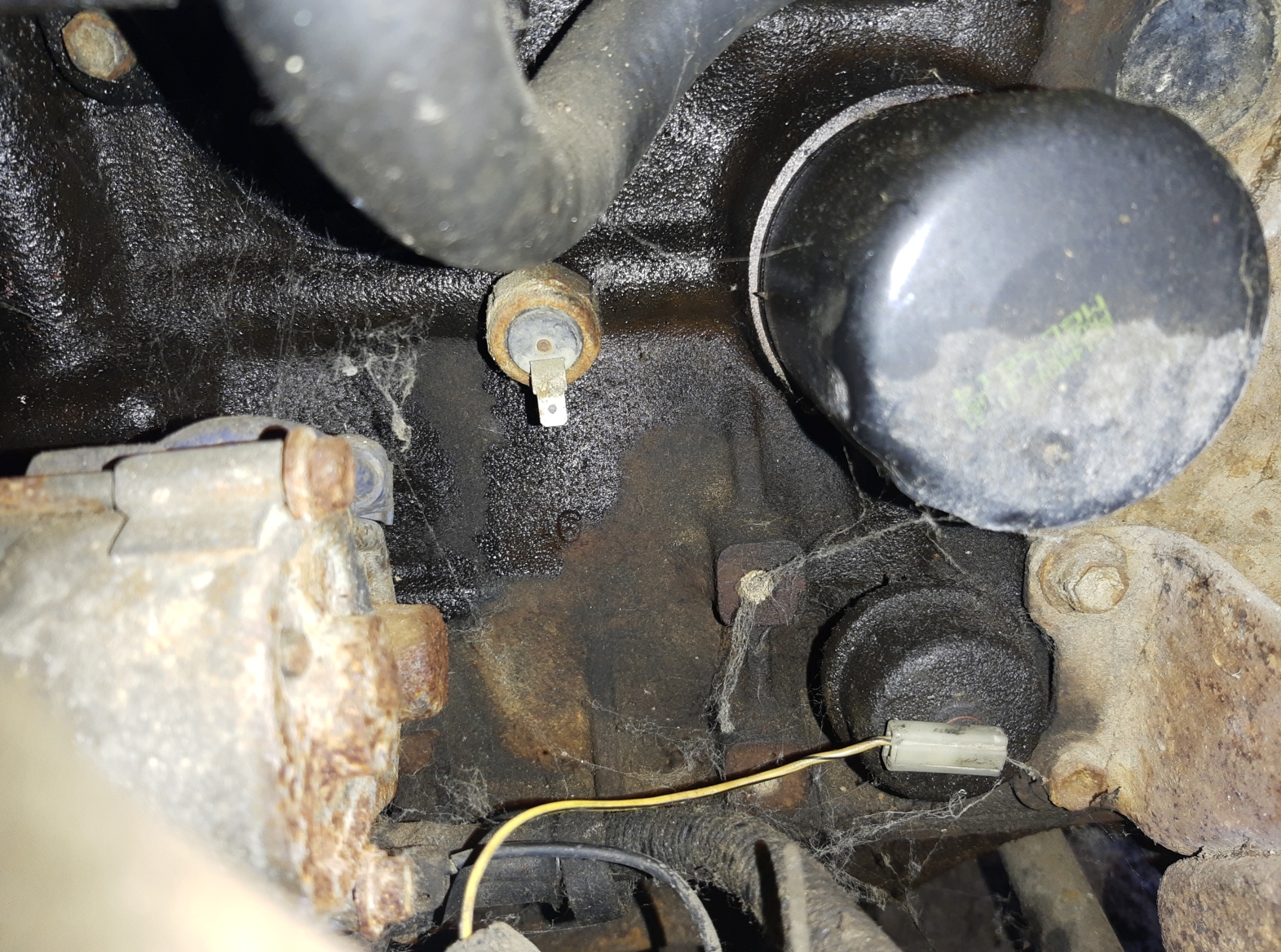 Here's the pic of the connector and it installed on the oil sender. The 4 bolts there around it should give you a solid location of where the "correct" spot is. The location where my oil pressure switch is installed should work just as well, but I'm assuming the thread on both are the same, both tap into the oil system to read pressure, so I'd assume the pressure is the same at both spots. My wire looks a lot more yellow/black now too. Since the adapter should be needed (anyone with a stock connector with out the notch in the side, shoot me a pm!), I'll just make pig tails for the connector since I'm sure it gets messed up quite often. It should have a click feeling when pushing on either terminal.