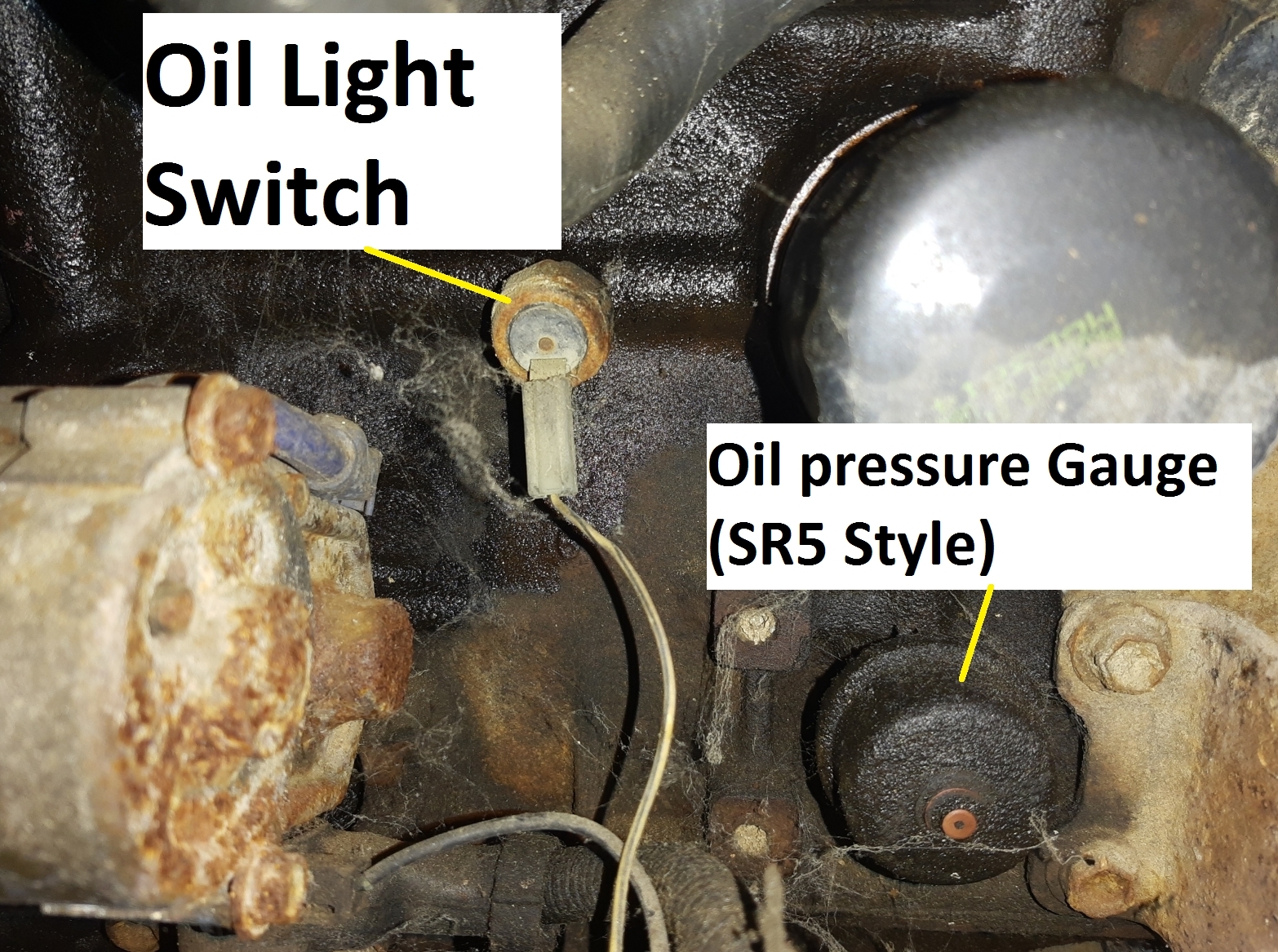 No problem. Here's an updated pic, might make more sense. You should be able to use the oil pressure guage one to actually read the pressure but you'd need an ohm meter. Sadly, I can't find the ohm specs for it. If you leave the engine off and take a reading, then start it and take a reading, if no change, you have 0 oil pressure. If the top end isn't rattling, you have atleast some oil flow though.