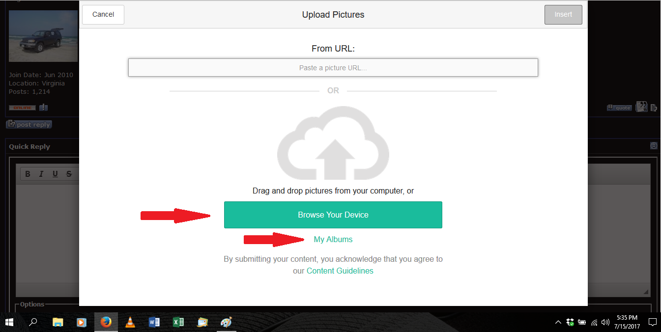 You will see this screen next. To upload a picture, Click "browse your device" or drag and drop your picture onto this screen. (If you have previously uploaded the picture to Yotatech, whether in a thread or to your albums, you can click the "My albums" link to find it) I will admit, I have not used the Albums feature much so I cannot comment on that yet.