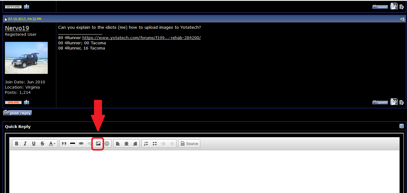 I plan on posting a "how to" once I figure everything out if no one has yet. I want to create a thread or have the mods edit the old sticky on how to post pictures on Yotatech, for future use and future members. Currently, it says to use a photo hosting site, and shows how to use Photobucket.