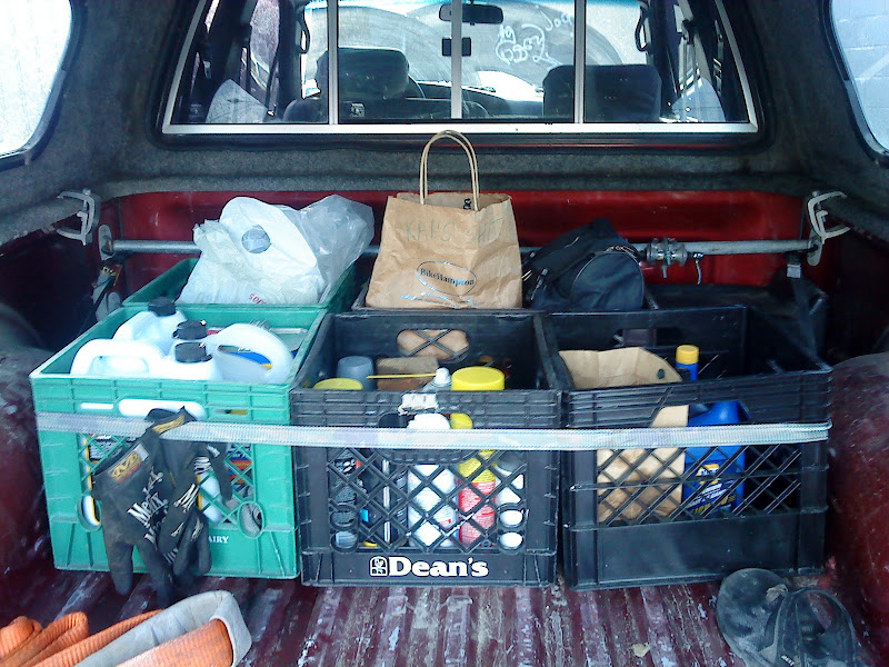 I also have about 6 milk crates secured with ratchet straps to the same tie downs i used for the bike carrier that are home to many of my tools, fluids, rattlecans, spare parts, etc.