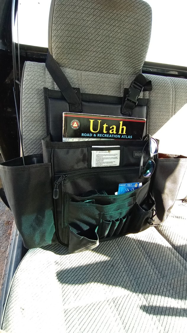 Thanks guys. I like the seat back organizer. Just have to flip it around to be a seat front organizer. When I have a passenger, I think I'd need a small version for the seat center area. It would also have to secure a different way since there is no headrest in the center of the bench seat. I may just get some webbing and sew my own.