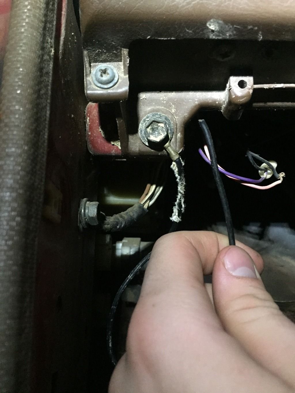 Hi all, I am trying to fix some issues with the wiring on my 1986 Pickup 22r. The problem I am currently facing is a broken ground wire. The wire is bolted to the dash below the drivers' side speaker location. I believe the ground is for the horn/hazards as that is the only part of the electrical system not working. Since the end of the wire has broken off, I need to know where it attaches in order to reconnect it. Any help is greatly appreciated.