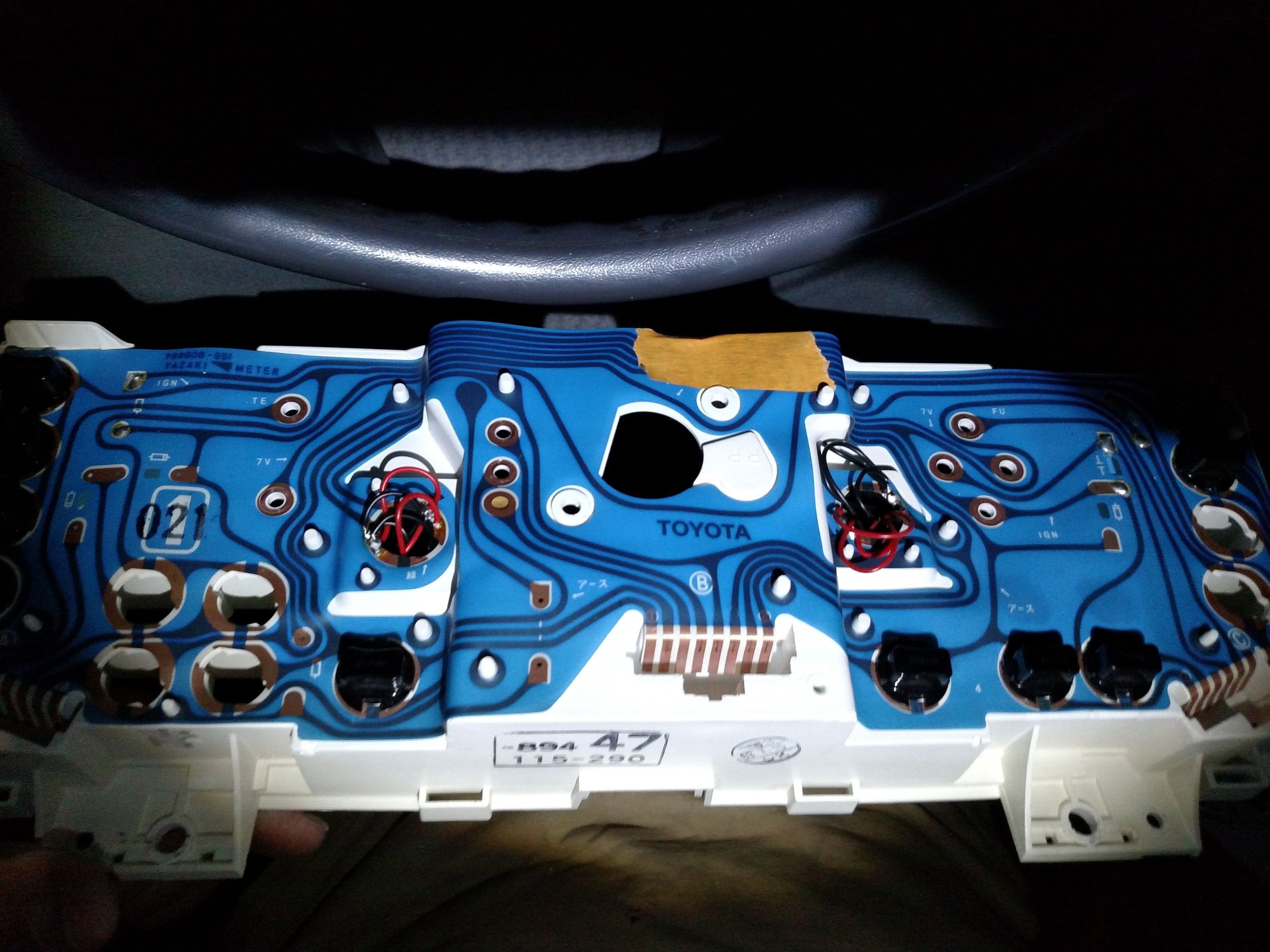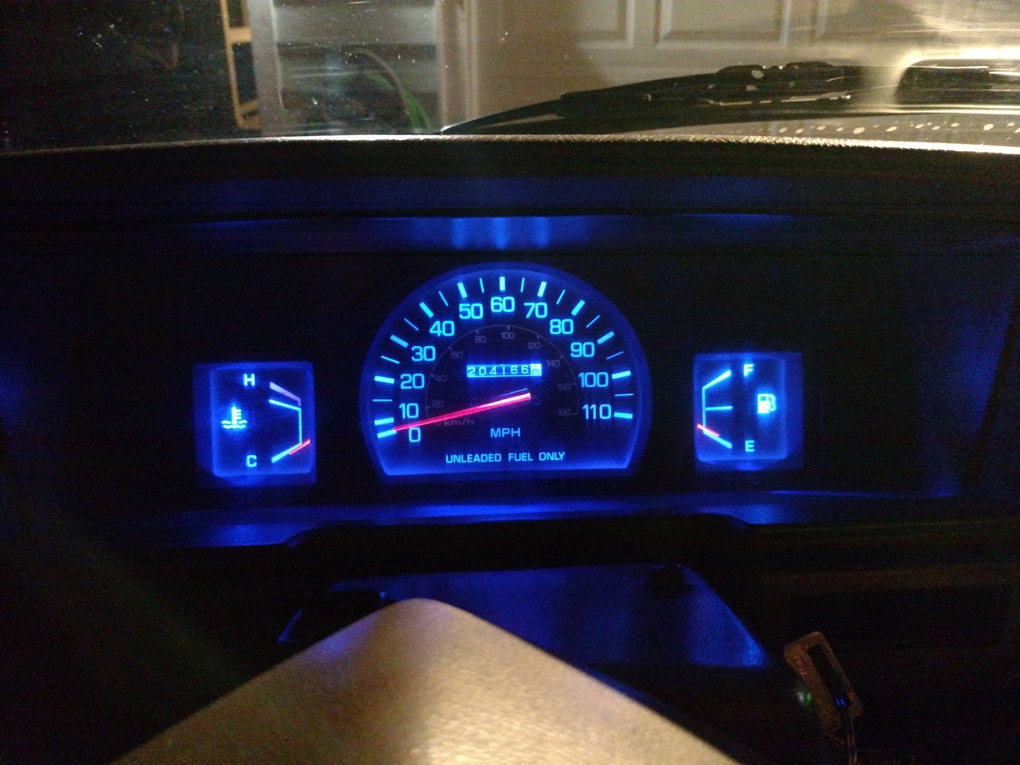 To get good light dispersion, I used small pieces of p360 scuffing pad from O'Rielly's Auto parts to scuff the LED's really good. The LED's needs to have a diffused outside surface to give uniform light behind the guages. Them I hot-glued them into place and angled the in the way you see in the pictures to give best light.