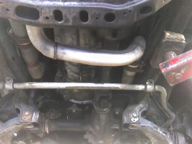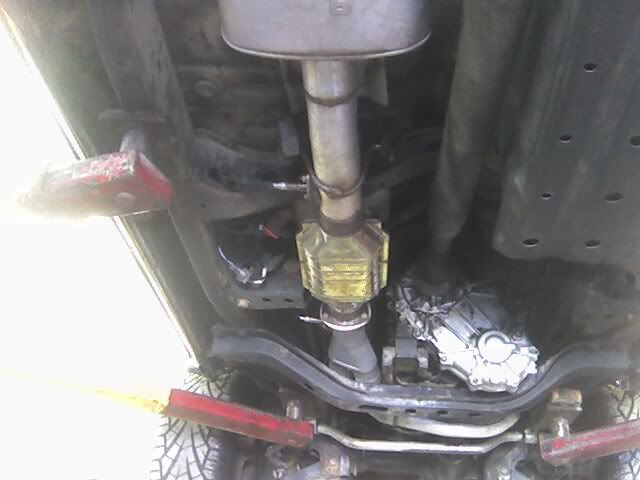 I don't have any good underneath pics; I found a couple I took with my cellphone shortly after I re-did my crossover. I used 2 1/2" swivel couplers and pipe from the headers into a Flowmaster dual 2 1/2" into single 3" out, then a 3" magnaflow cat (all in the pics), then I tried several different mufflers until I found a combination that worked best. I'm currently running a stock Dodge Ram muffler and a Summit race resonator after it (no pics of that stuff though).