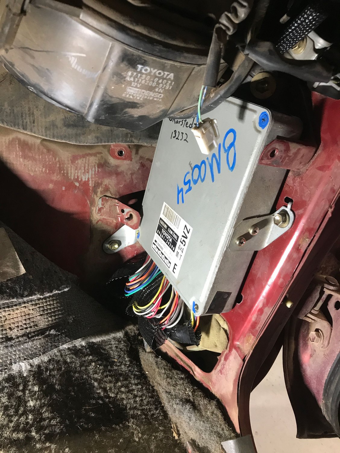 The ECU is much bigger, so It took a little trial and error to get it mounted. I was only able to use 2 mounts, the right (rear) from the 5VZ, and the bottom left (front) from the 3VZ, but with a little tweaking both lined up with the original mounting holes.