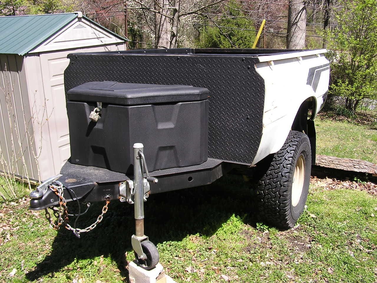 I built this trailer to go with my '82 toyota 4X4 that I sold last year. I used another '82 toy 4X4 shortbed for the frame and bed. It has a custom axel by Redneck that has six on 5.5 lugs with toyota lug studs for wheel and lug nut compatibility. The suspension is all Old Man Emu with heavy duty springs and greasable shackles to match what I had on my truck. New BFG all terrain ta/ko 31X10.50 15 tires on stock steel wheels that have been powder coated. Triangular heavy Duty polymer lock box from Tractor Supply in front of the bed. Swing down heavy duty Crank leg (I have a new flotation wheel/tire to replace the hard plastic one that's on the leg.) tailgate is off a different year model but it's as close as I could find and works fine. Wired for four prong plug and lights work. Set up for 2" ball. Bed needs the inside floor surface rust swept with a sand blaster or serious wire brushing, only surface rust. Outside could use minor From the inside out ding removal on a few places. It follows great at off-road speeds and does good on highway IF load is balanced front to back and side to side, otherwise it tends to sway. I believe a quick release axle to frame connector system would completely remedy the swaying. Tagged and titled in North Carolina. I'm just looking to get my money invested back out since I don't off-road anymore. If I did I would have finished it and be towing it behind my old truck. I need