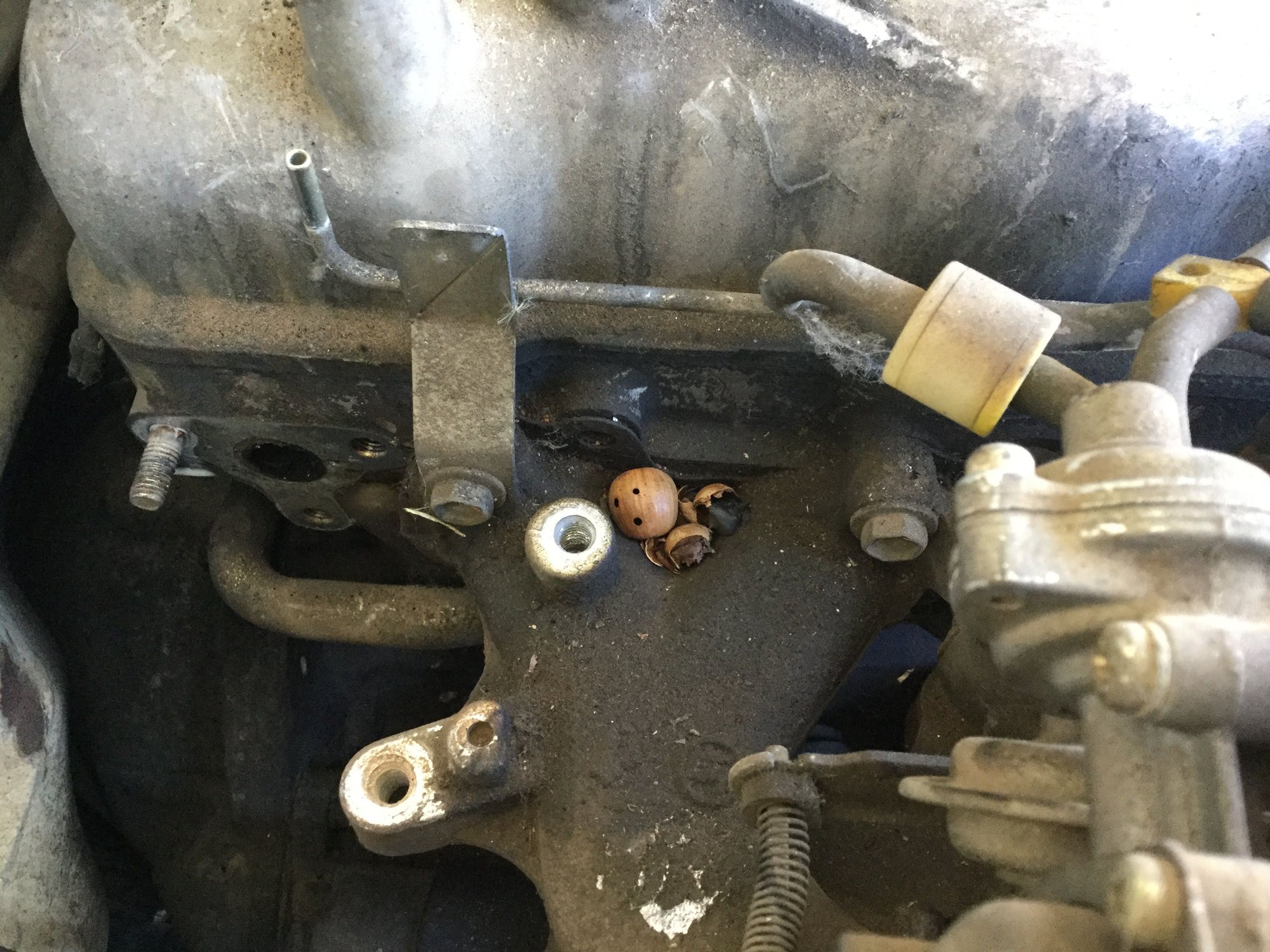 This photo shows where the bolt went missing that allowed the motor to oil down everything...(distributor set bolt)...was plugged with whatever OP had lying around (3/4” w/out washers), instead of the 30mm it should have had...don’t ask how I found out.