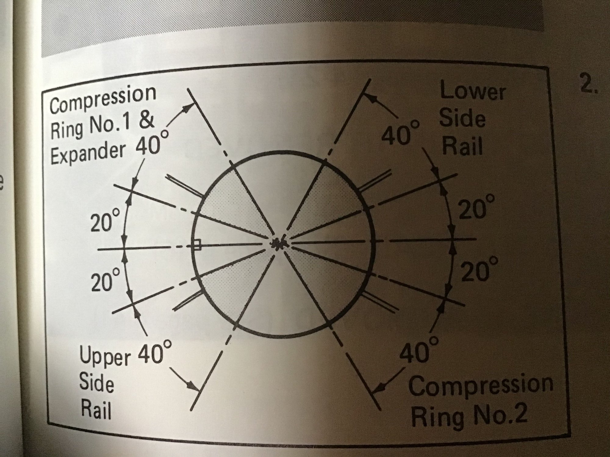 I found this diagram in the FSM on how the compression ring gaps and oil wiper ring gaps should be placed in relation to each other so that’s how I did it.