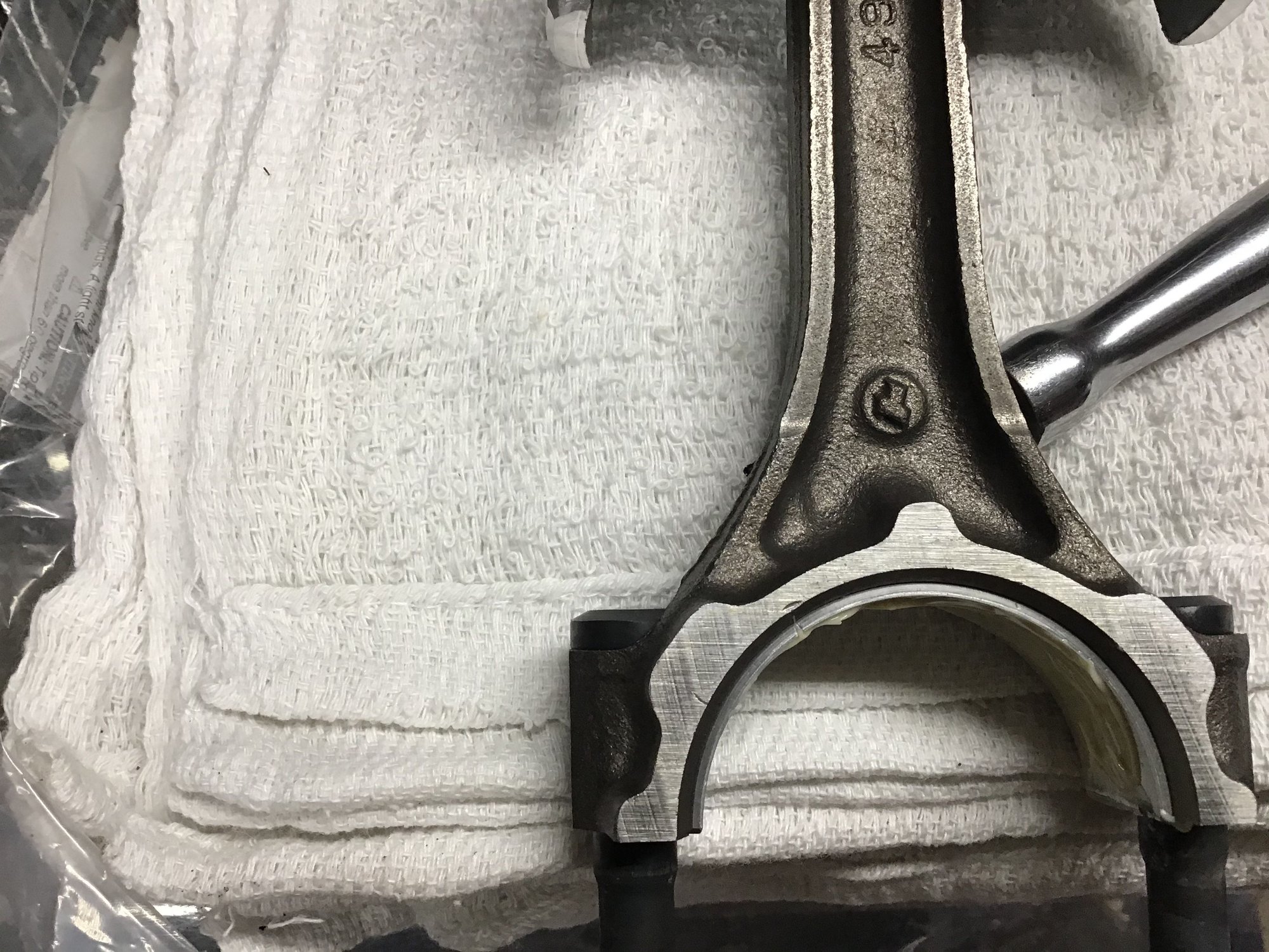 Also verified per the FSM that the mark near the bottom of the connecting rod in this photo pointed to the front of the engine and coincided with the directional arrow on the top of the pistons. Everything checked out.