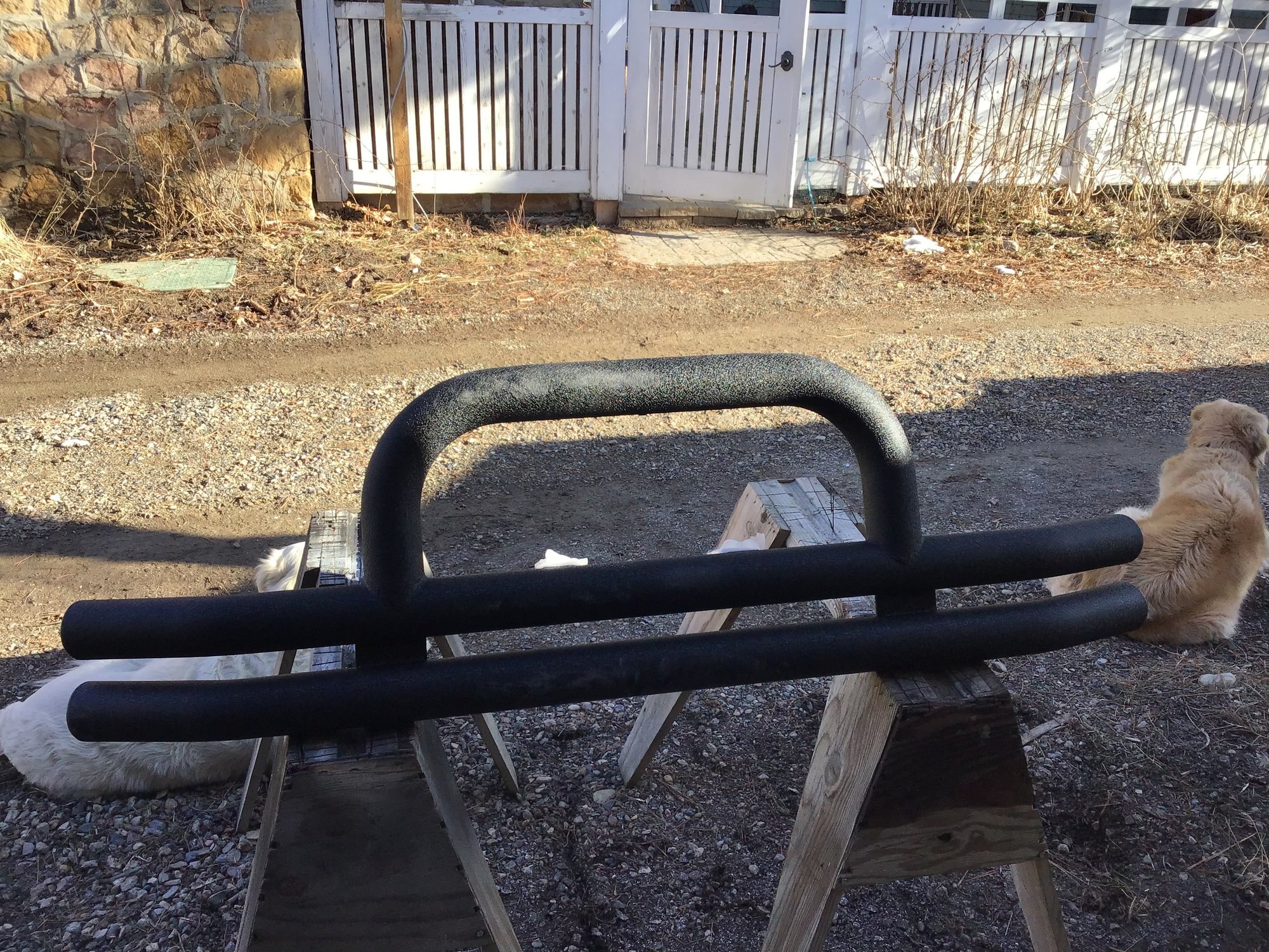 The front tubular bumper arrived today courtesy of Fed Ex. It’s manufactured by Barricade Off Road and marketed by Extreme Terrain. Smittybilt still has the double tube bumpers for sale on Smittybilt.com but their overall width was 56”. The Barricade bumper for the 1976-86 CJ7 is 61” wide which is just right. The right length plus free freight and priced at $239 was a good deal. Now to figure out how to bolt it up to the Toyota front end. Overall weight of the bumper is 28 pounds. Here are some pics.
