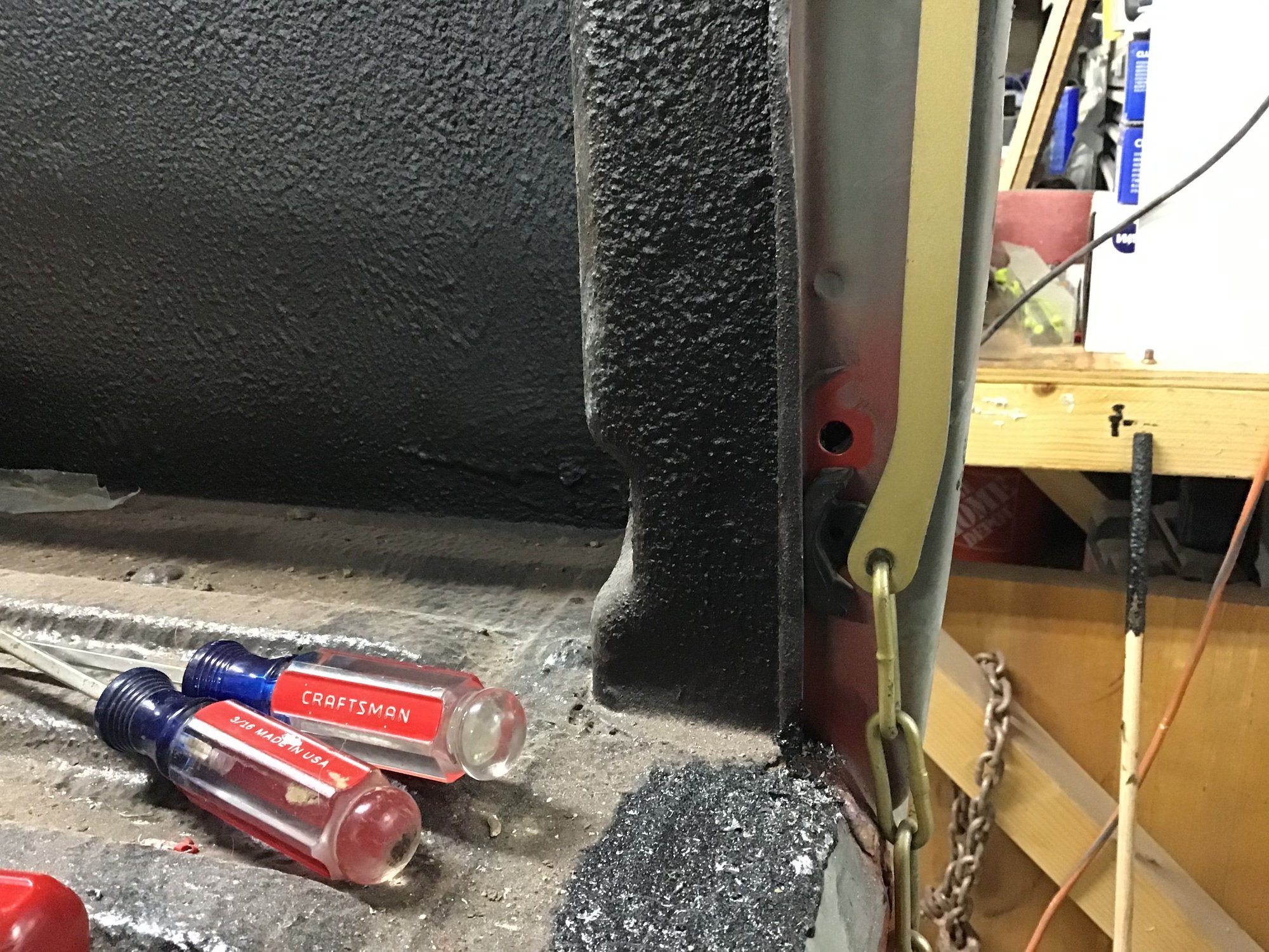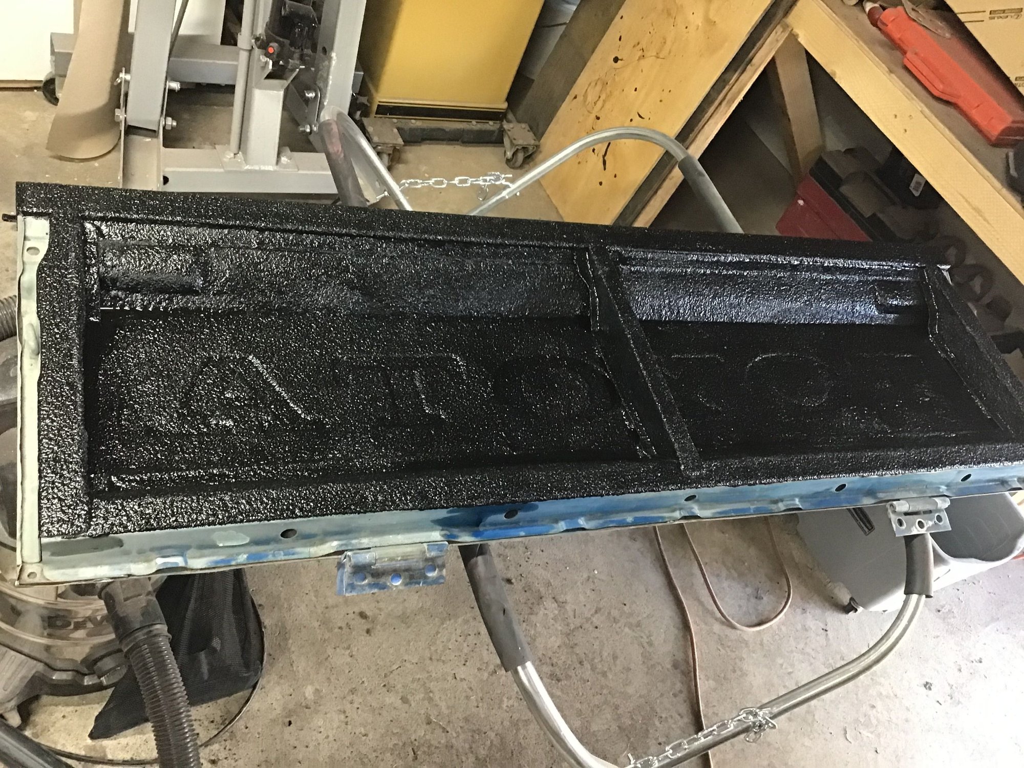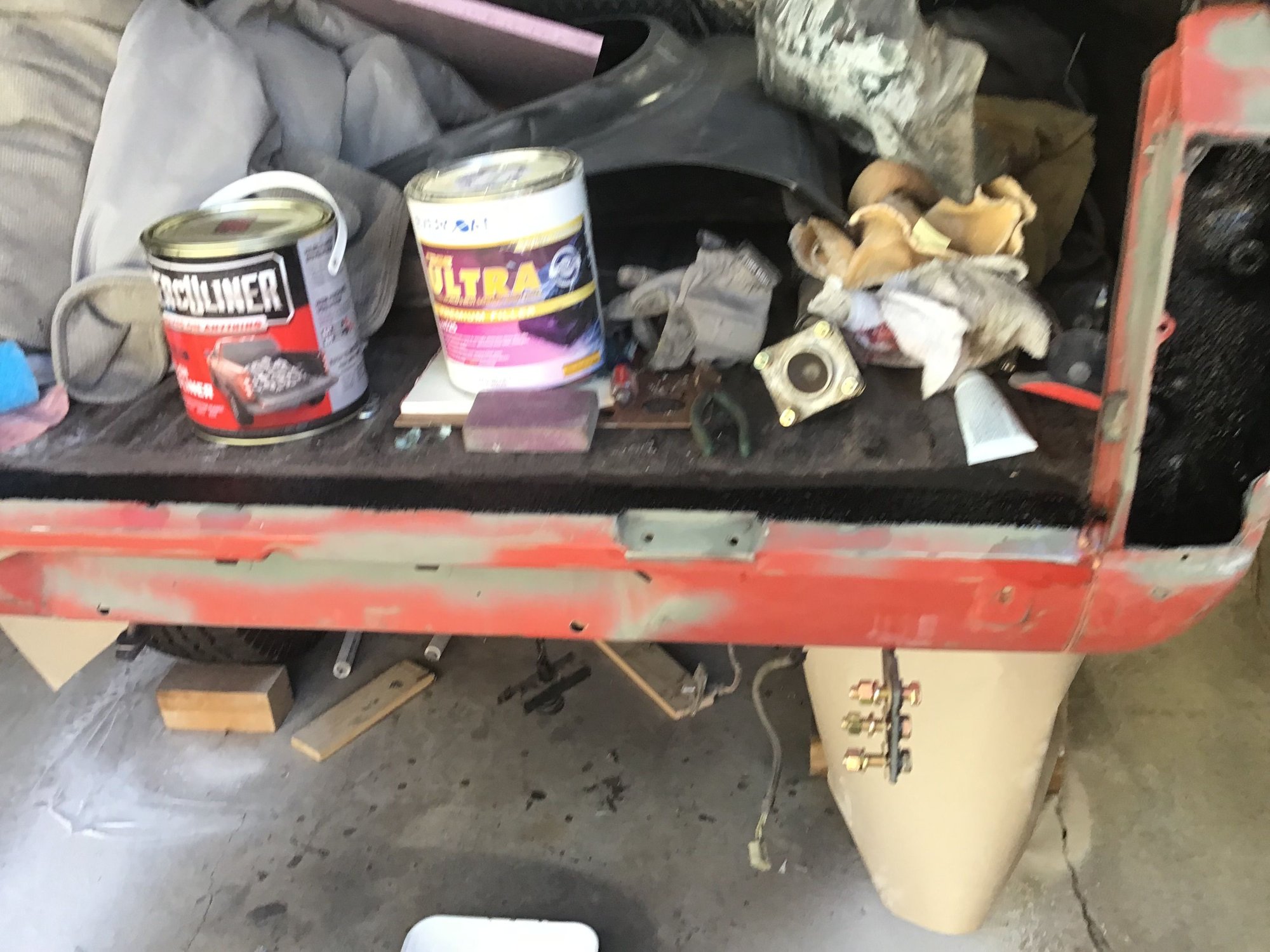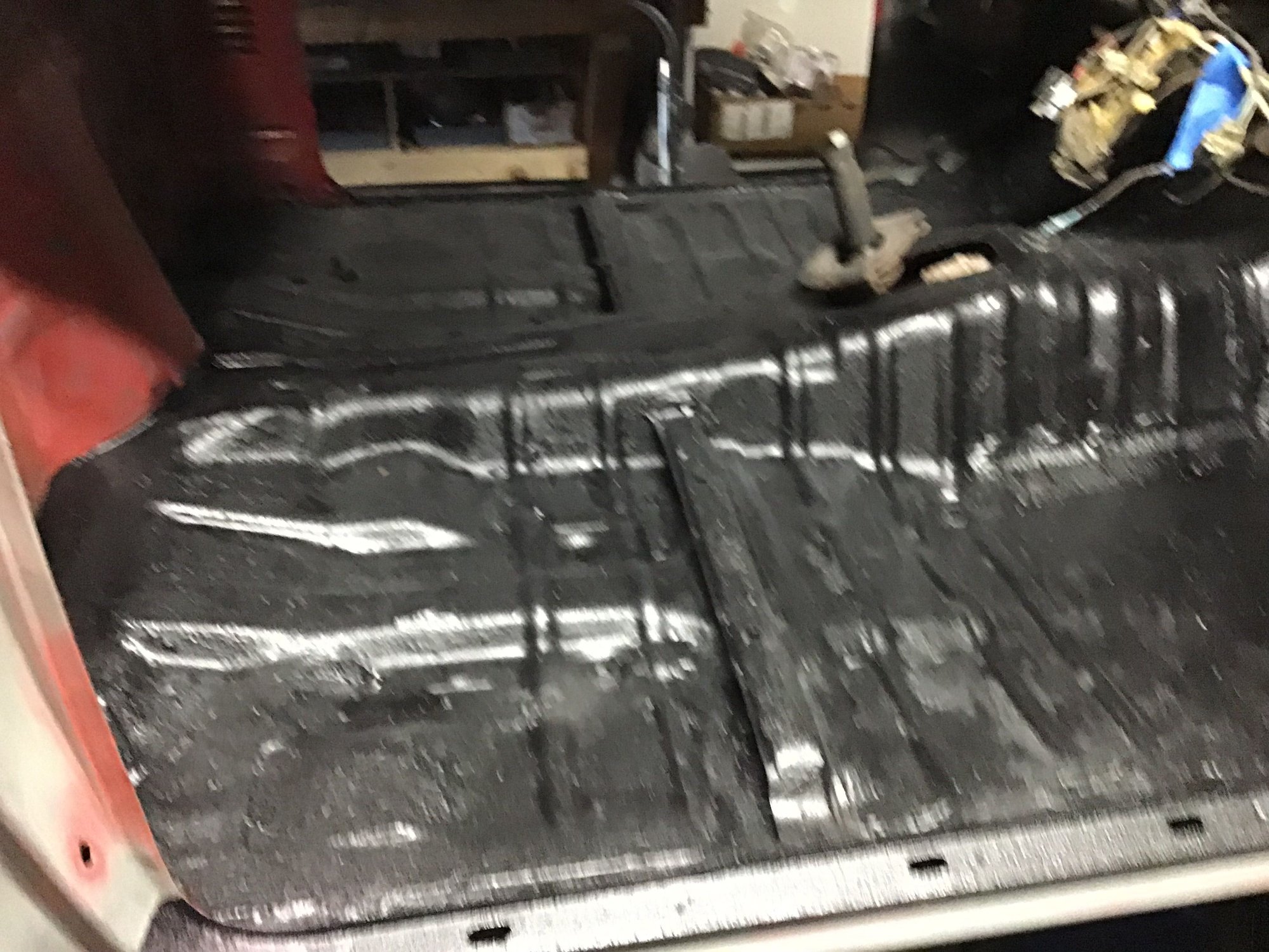 Also forgot to take pictures of the bed front and cab back which each got bed lined. The bed is bolted back down now so it’s hard to see any lining. 9