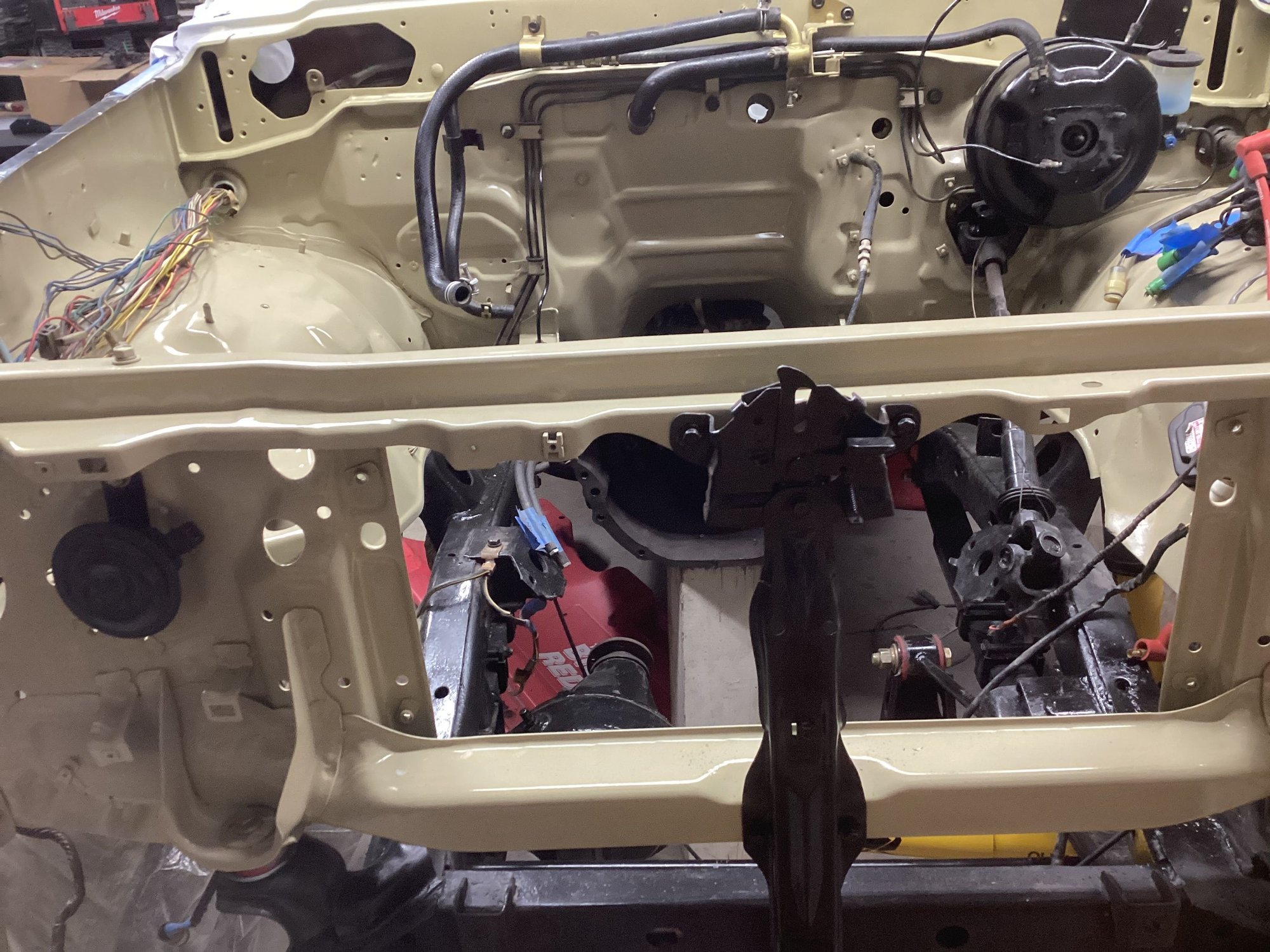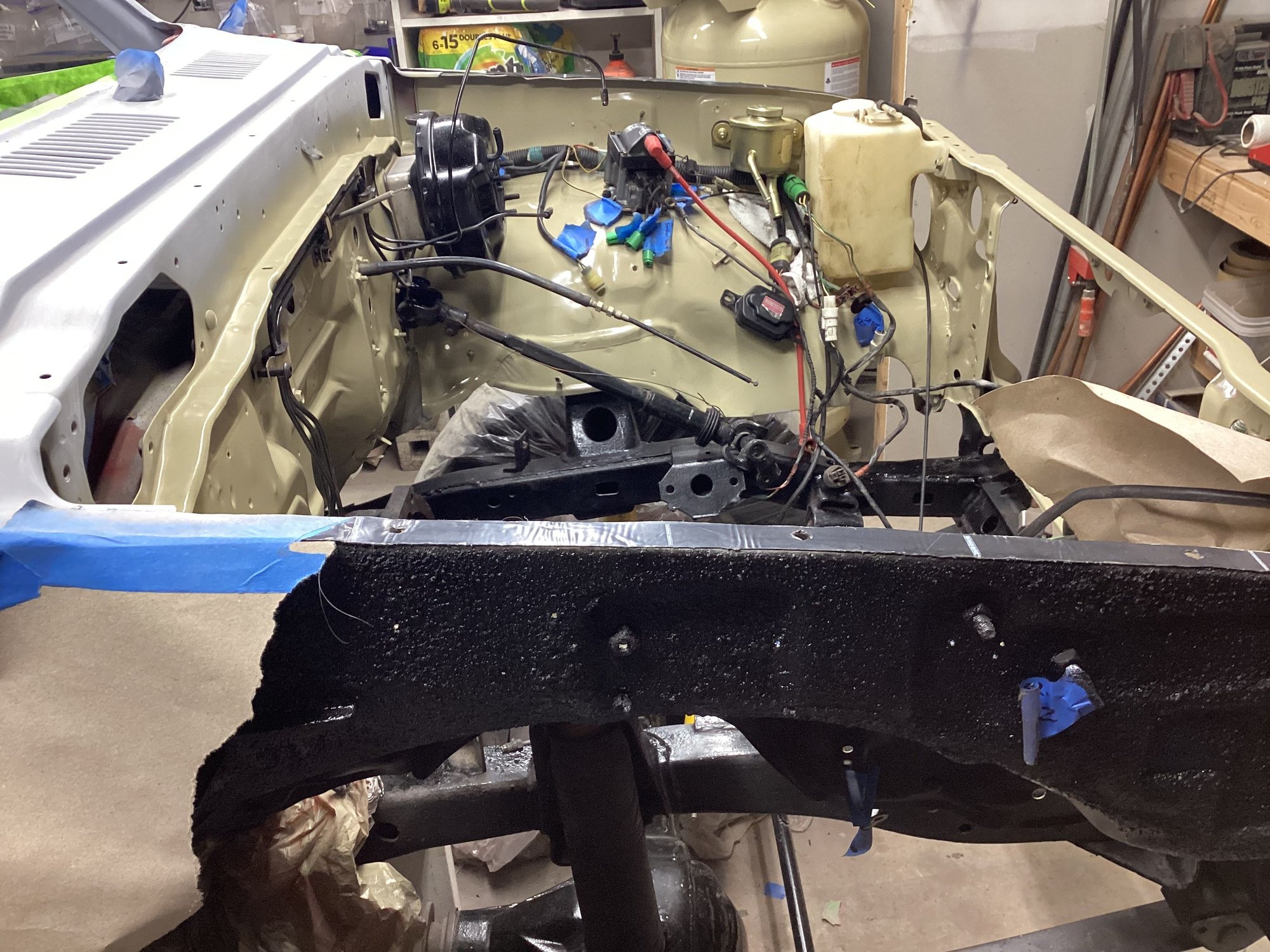 Did a little more re assembly work this afternoon on the windshield squirters, hood hinges, underside of hood, etc. Still waiting on a throw out bearing and clutch master cylinder gasket to arrive. Here are a couple updated photos.