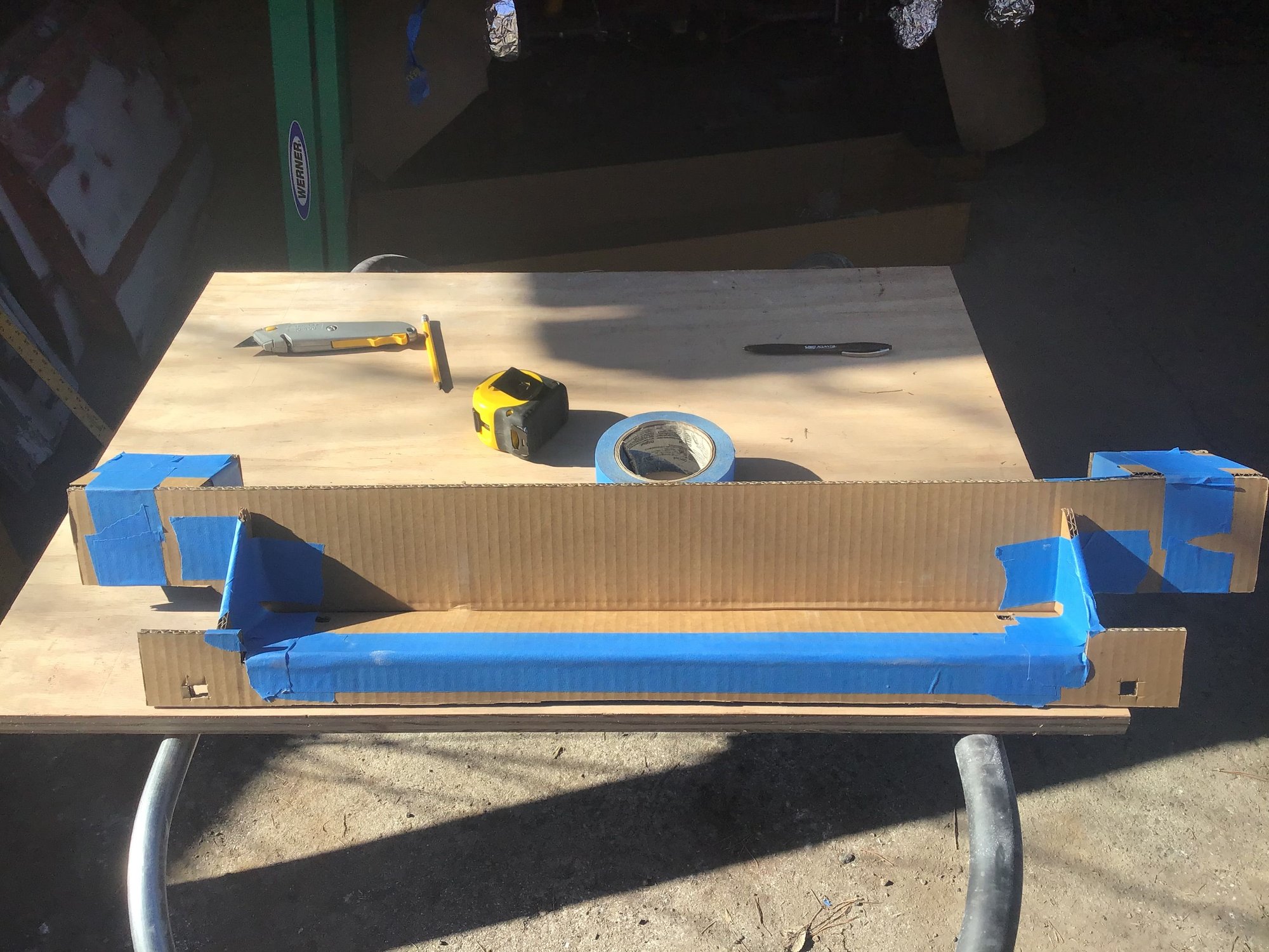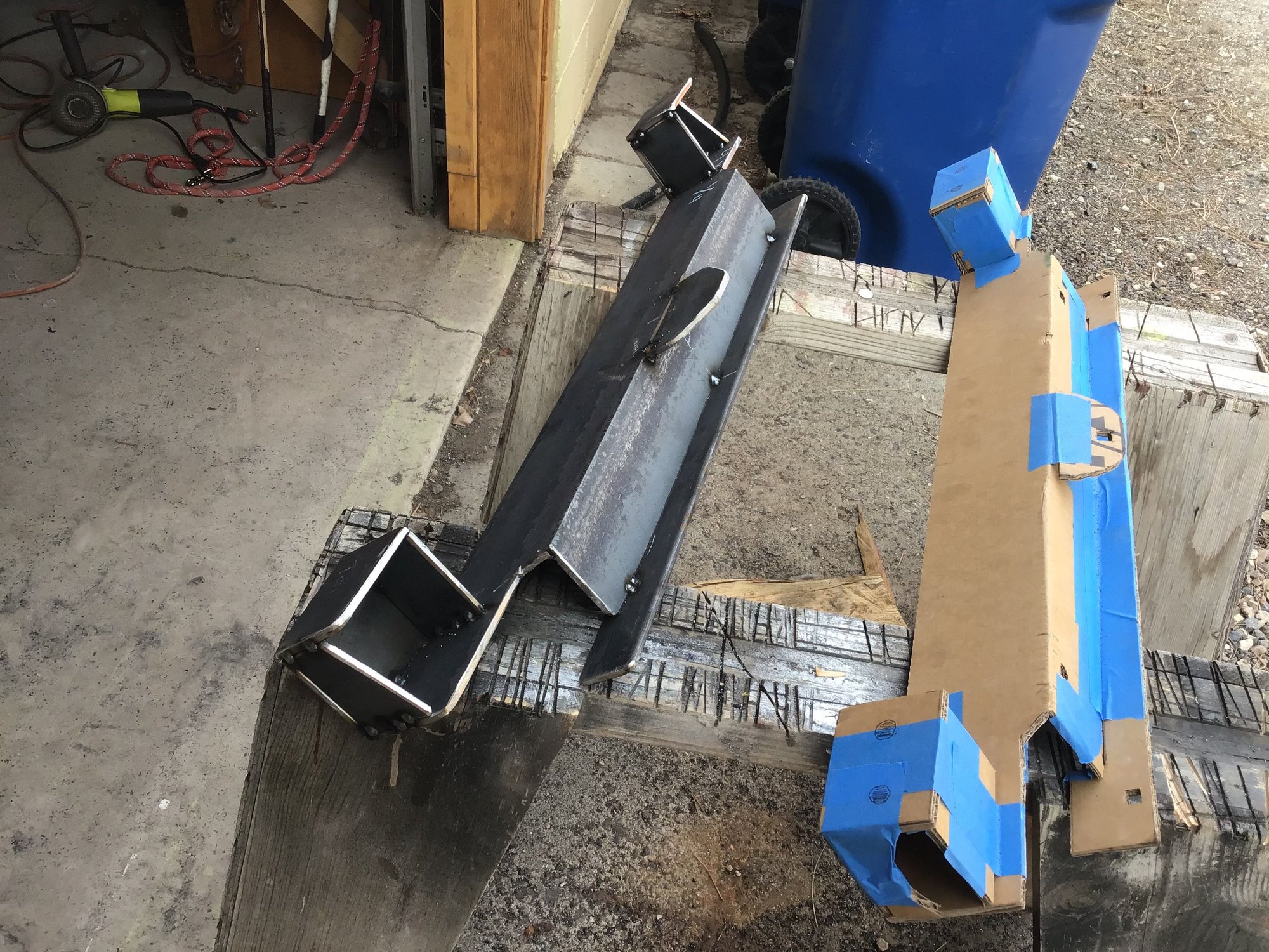 Finally found a little time this afternoon to get back to the bumper bracket. A steel cutting blade on a Skil saw was used to cut the 1/4” plate and it was shocking at how clean and easily the cuts were accomplished. After that the pieces were tacked together following the cardboard mock up as a guide and hopefully the holes can get punched in the bracket tomorrow for a test fit.