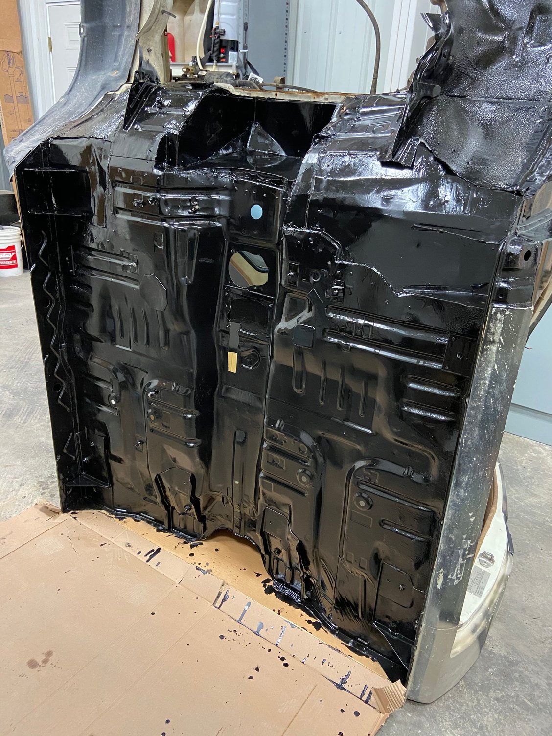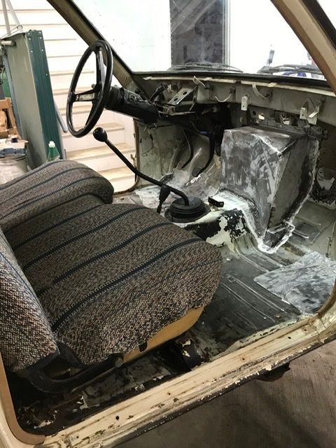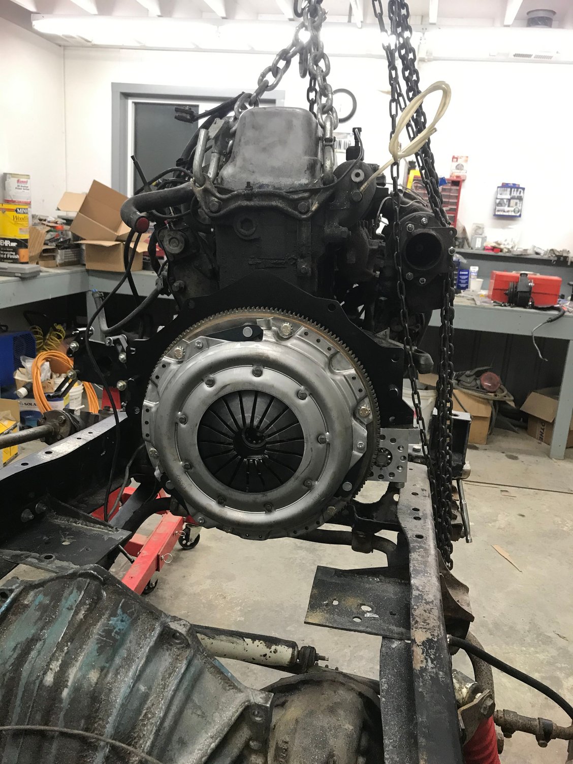 i got the clutch and flywheel in a while ago, got the motor back in for hopefully the final time. Then I put POR-15 on the underside of the cab and the frame. Got brand new doors and hood, cut the fenders flush on the front end.